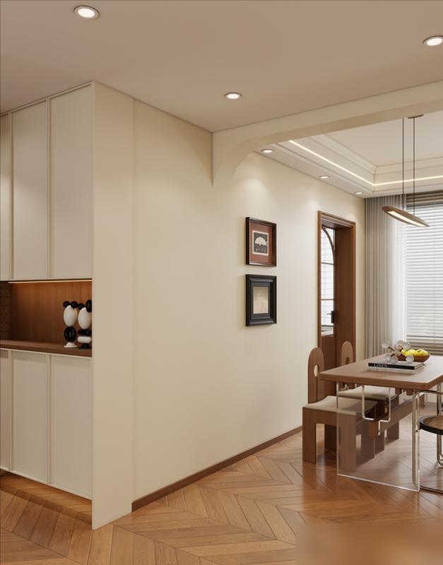 通鋪魚骨拼地板更是神來之筆,斜向紋理自帶延伸感,踩上去腳感紮實,遠看地面像流動的河面,悄悄把十幾平米客廳"拉長"了一截。