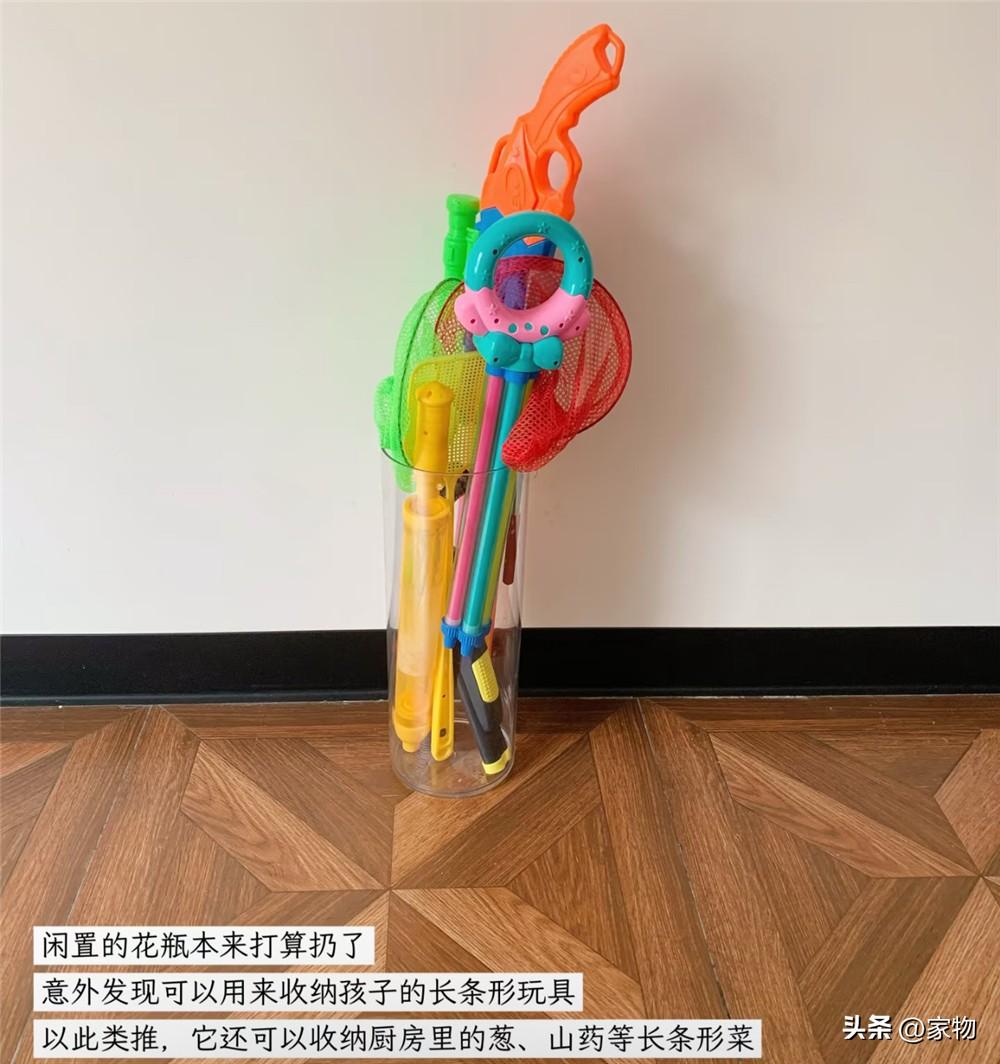家裏閒置的高花瓶,其實已經閒置了很久,就在我決定扔了它的時候,卻發現剛好可以用來收納水槍、吹泡泡器、漁網等一系列孩子的小玩具,同樣放在門後,不佔地兒的同時收納妥當,愈發覺得自己明智!