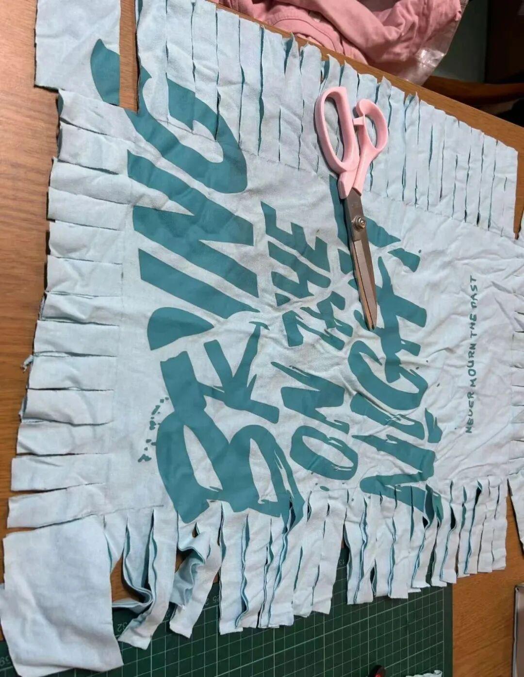 保持前片印花完整,將後片剪成與前片同等大小,中間留下做抱枕面,四周剪成均勻布條做流蘇。