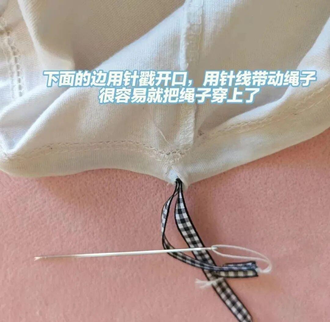 然後剛剛說的T恤邊,就是我們穿繩子的通道,從一側挑開線,把提前準備的抽繩穿進去。