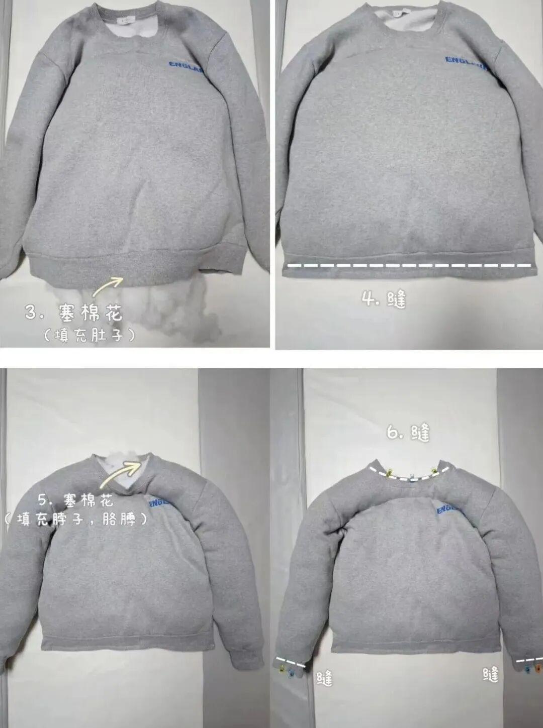 然後再往袖口和衣服裏塞一些軟的填充物後,縫合即可,簡單又省事。