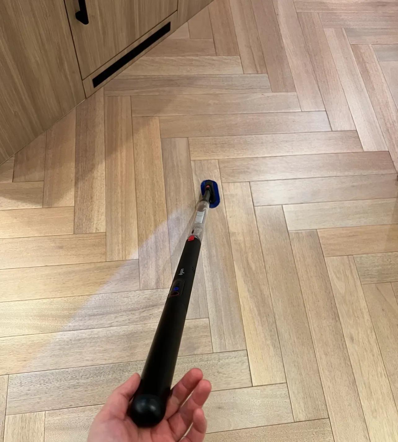 有點意思,它把吸塵器都做成掃把了!很纖細一支,重量還不到一公斤,跟我的超薄筆記本差不多,吸個地,舉高清潔那是相當輕鬆。