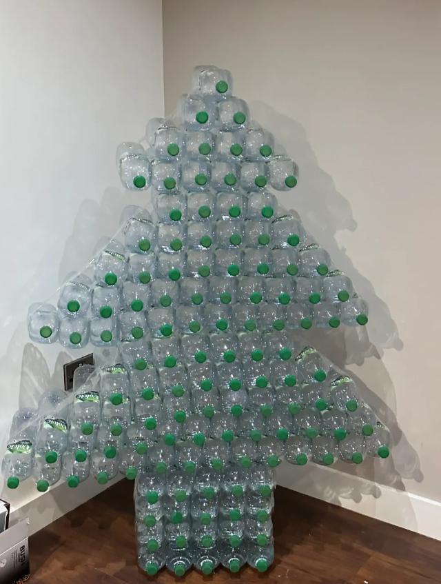步驟當然也非常簡單,直接把礦泉水瓶子擺放在地上,擺出聖誕樹的造型,找膠帶粘緊一點。最後再“立起來”,你看,一個簡易的聖誕樹就做成了!