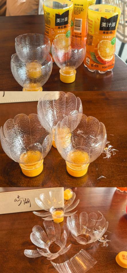 1.準備3個美汁源飲料瓶,用剪刀剪成花瓣的模樣(其中一個留着瓶蓋);