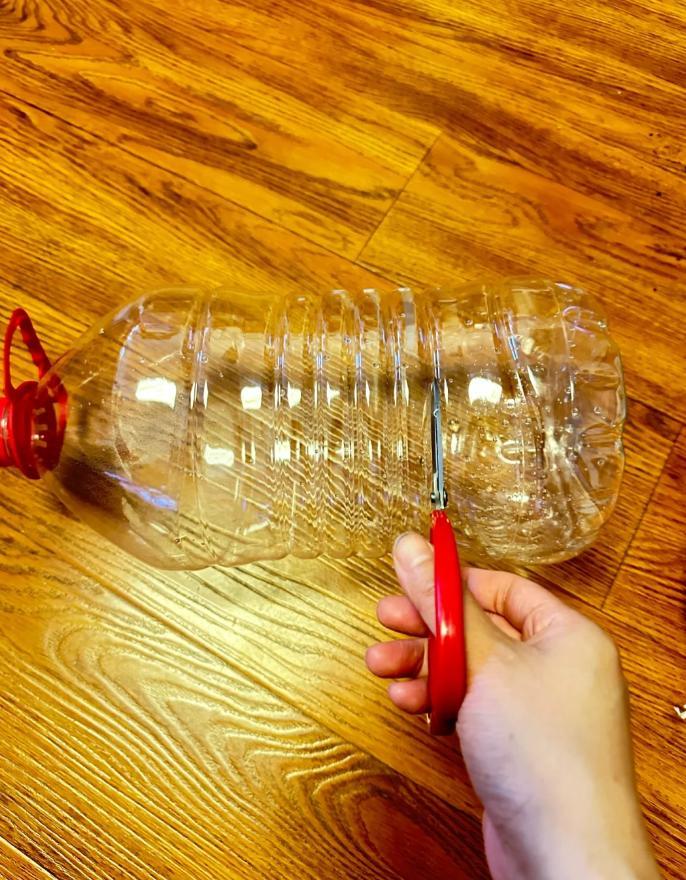 用5L的礦泉水桶,洗乾淨之後,直接拿剪刀剪幾刀!