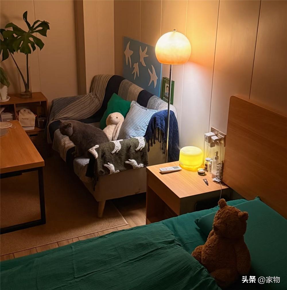 入夜時分,打開沙發邊的落地燈,隨即散發出暖色的光暈,爲家中增添了些許溫馨的氛圍感。