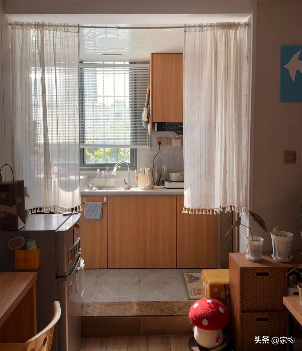 廚房也並不是單獨的隔間,只是用紗簾進行簡單隔斷,並增加地臺,相當於劃分出區域,並給下水管道足夠的安裝空間,正對着的窗戶也是採光絕佳,給這小小的空間增加了些許明快色彩。