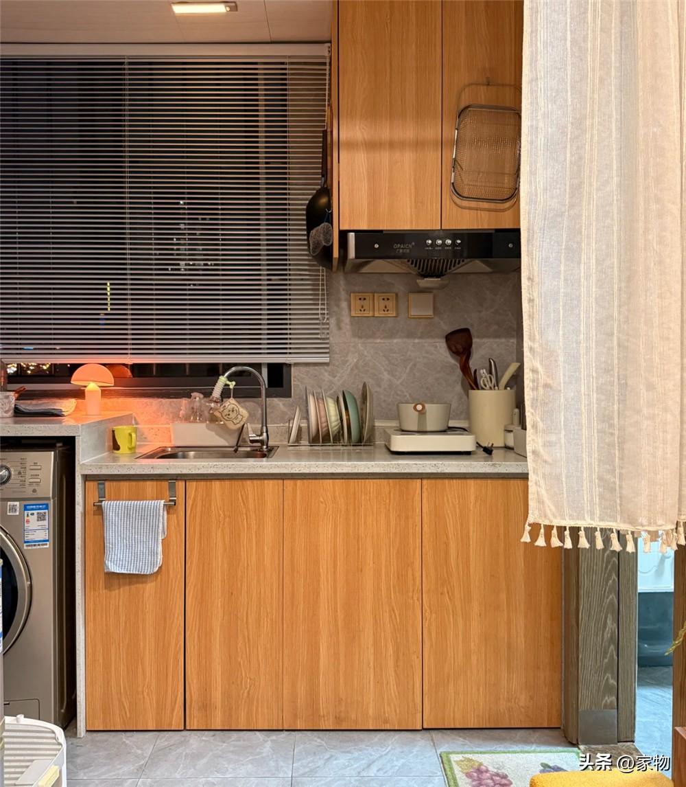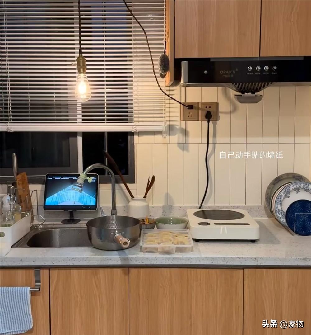 廚房做一半吊櫃,再搭配底櫃收納各種碗碟餐具和瓶瓶罐罐,檯面上則用電磁爐代替傳統竈臺,平時簡單煮個面,或者做些速凍食品都非常方便,反正一個人住,能滿足基礎生活需求就已經足夠。