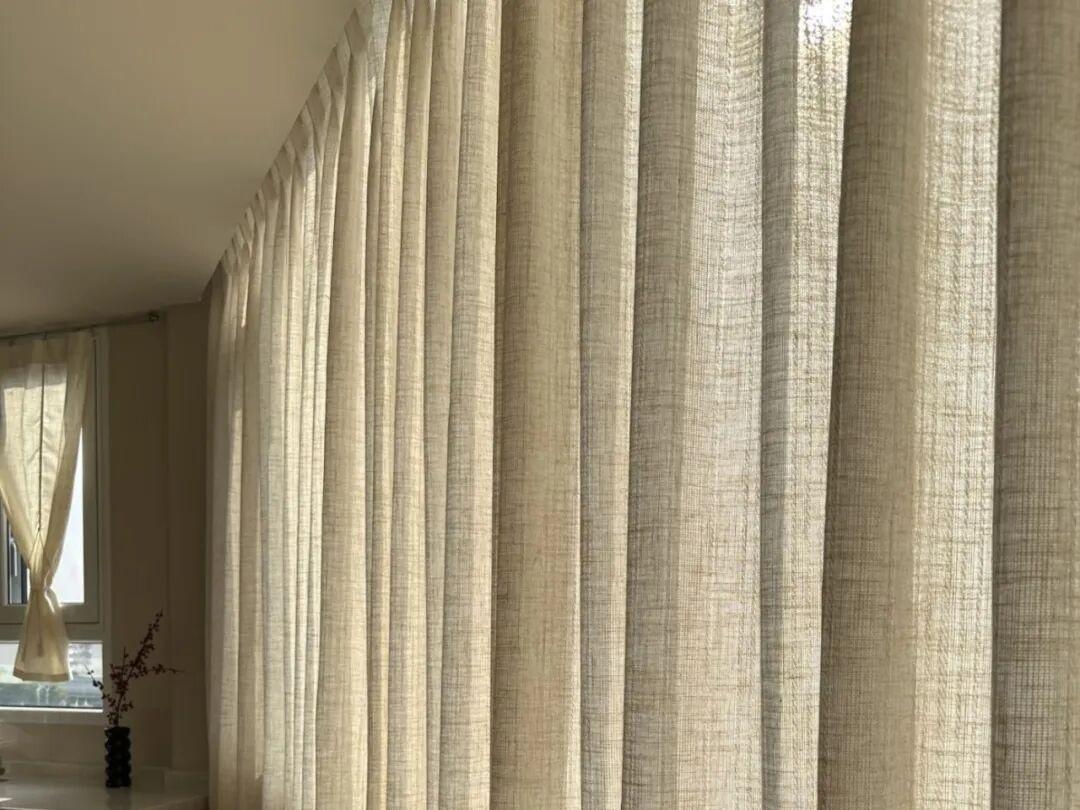 而且閨蜜是在網上選的尺寸定製的。而且負責上門測量,精準測量家裏的窗戶的尺寸。一層是透光的素色亞麻窗簾,一層是遮光性很好的亞麻混紡窗簾。