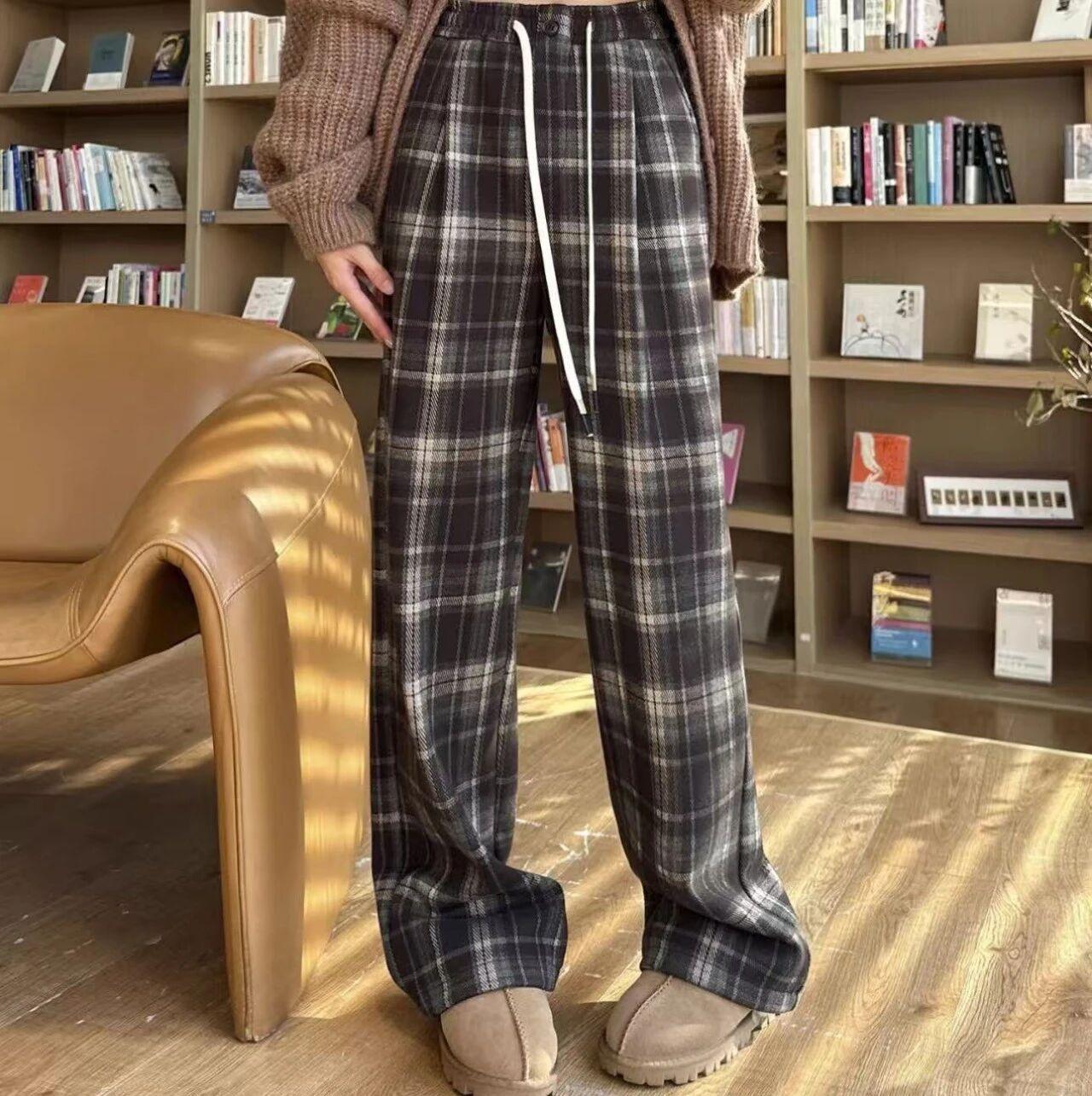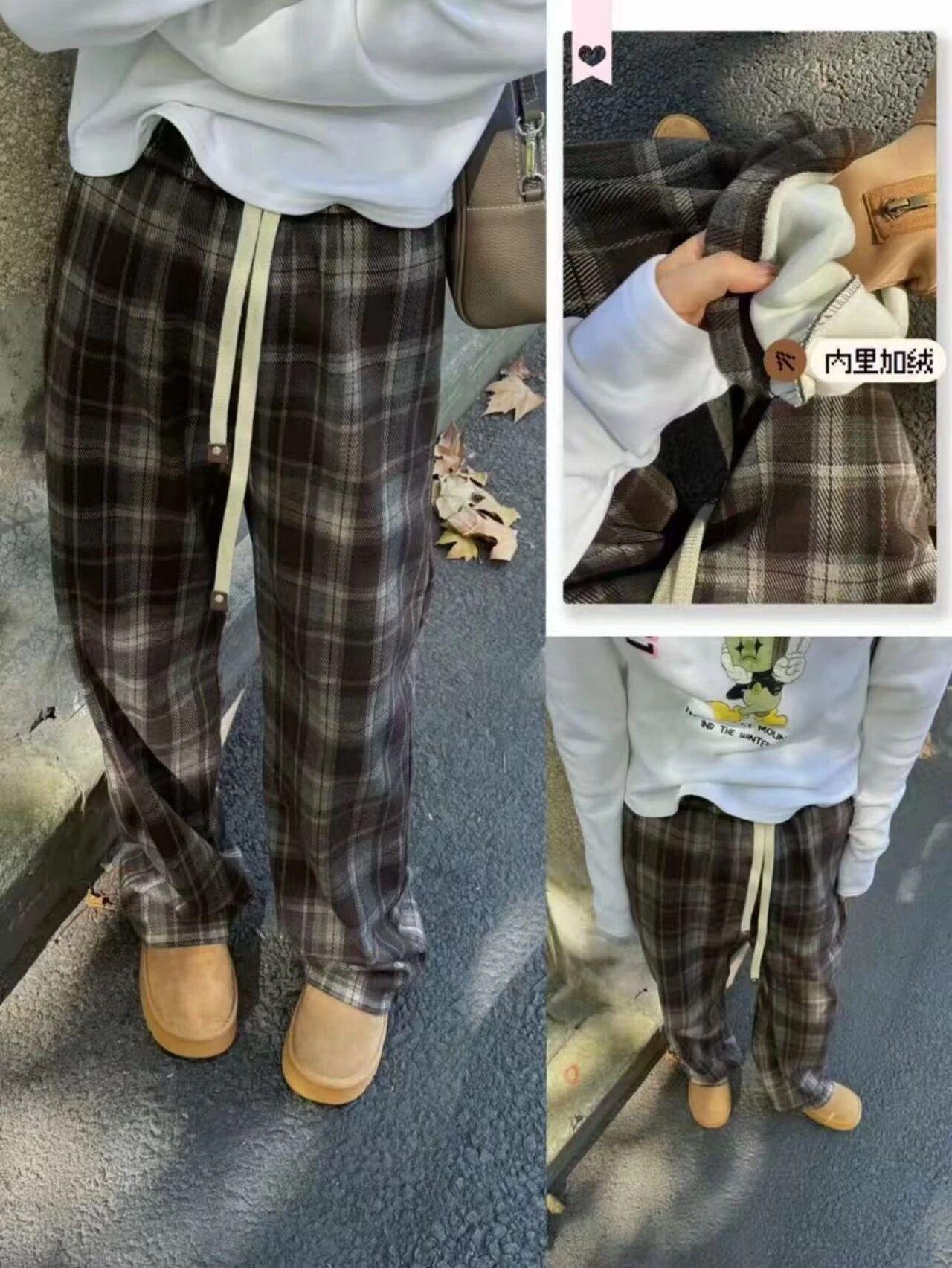 加絨格子闊腿褲