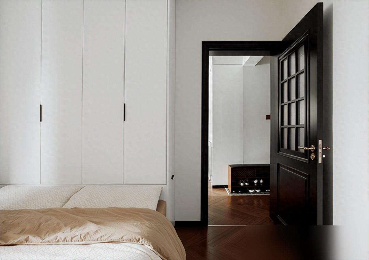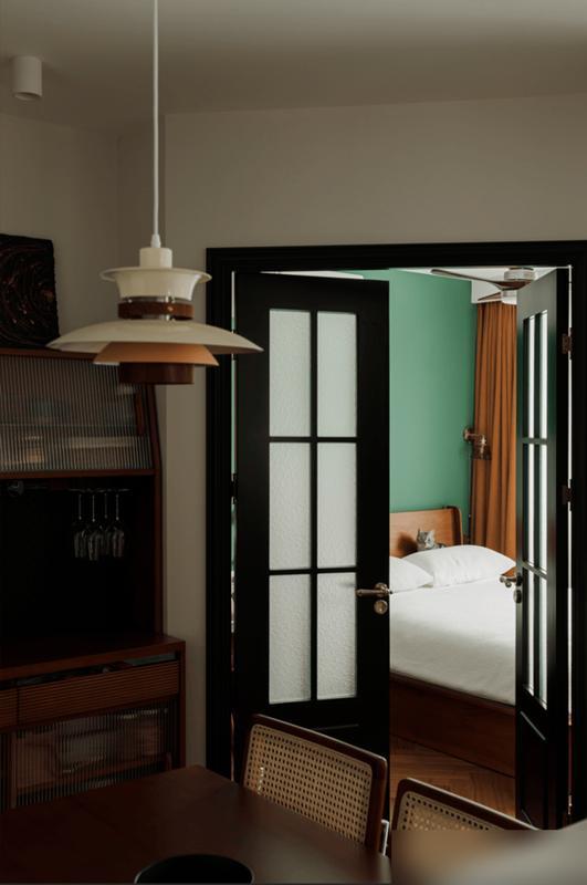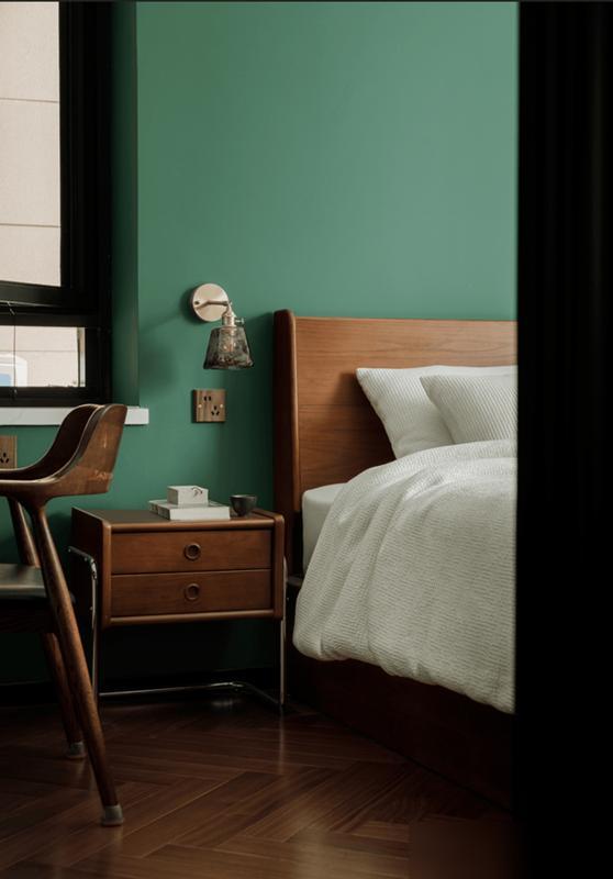 深色地板配細高櫃,反顯層高挺拔;墨綠牀頭牆助眠,柚木百葉添暖調。