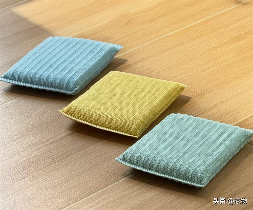 一包裏面三個不同顏色的海綿擦,分別用來清潔廚房的碗碟餐具和鍋具砧板,不容易弄混。