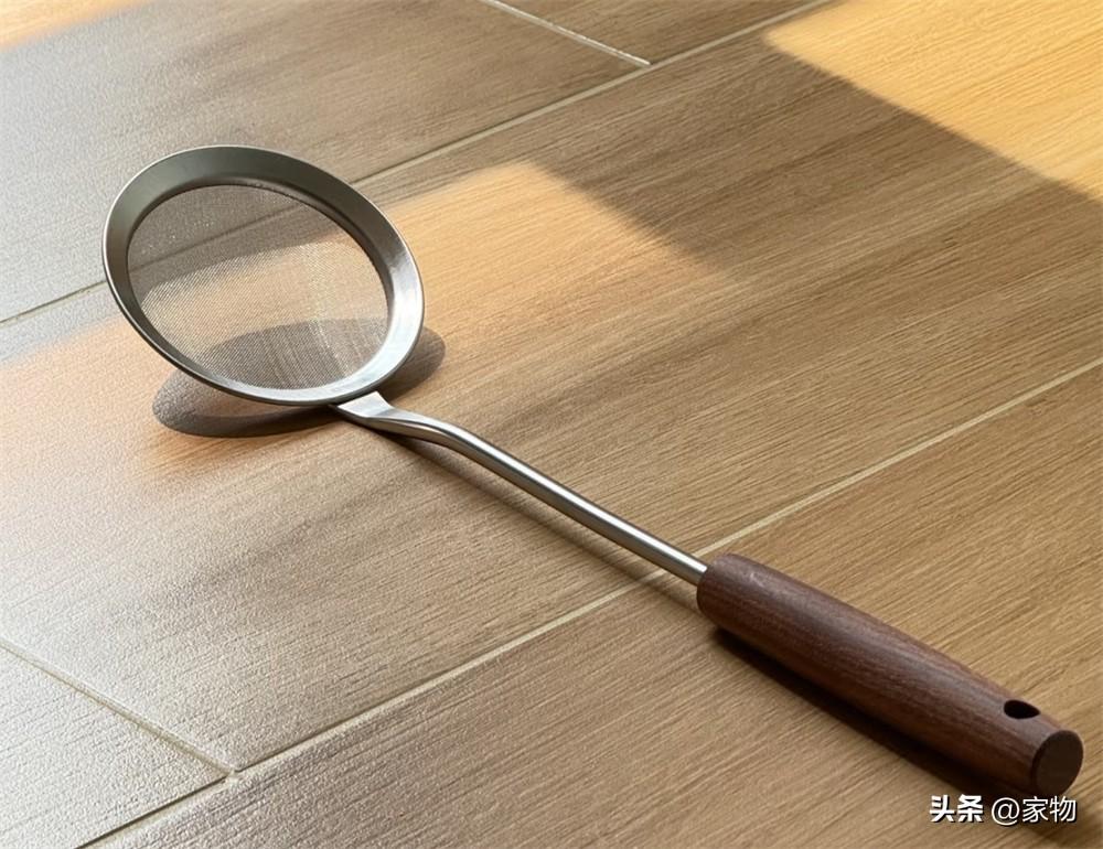 也是我用了很久的一個小漏勺,手柄是木質,隔熱防燙的同時,又增添了幾分設計感,濾網也足夠緻密,用來撇沫再合適不過;不用的時候還可以將它掛在廚房的掛環上,收納更是省心,總之,這小玩意格外實用。