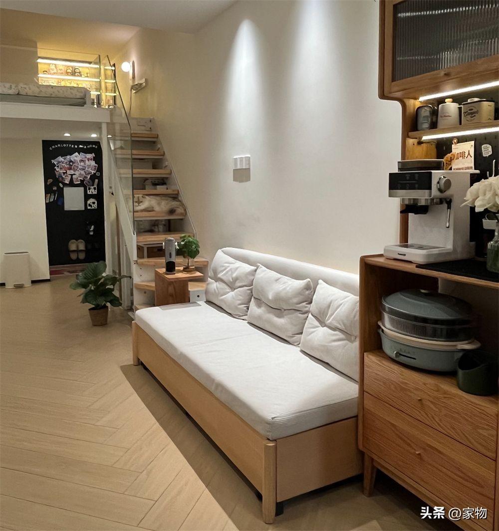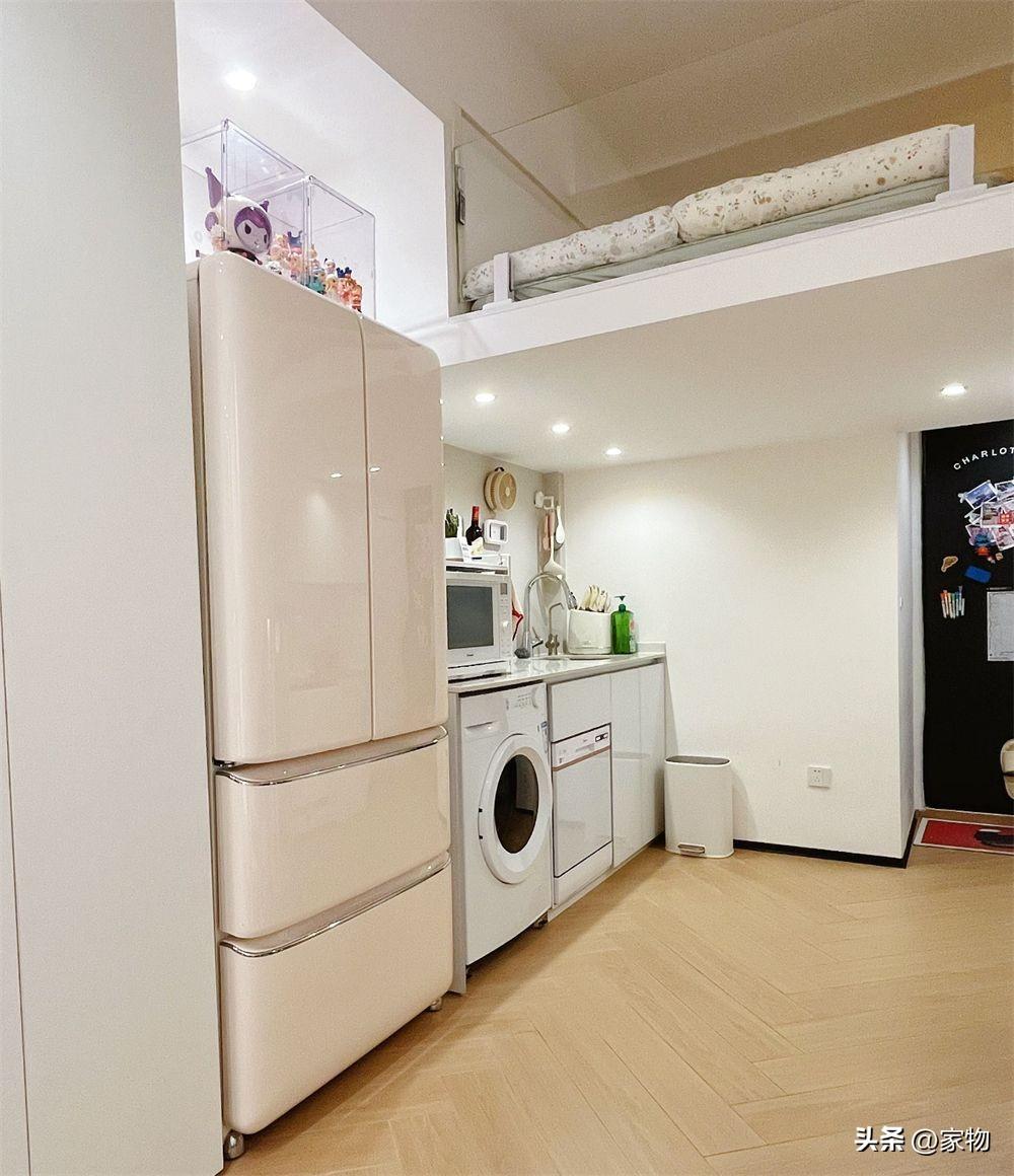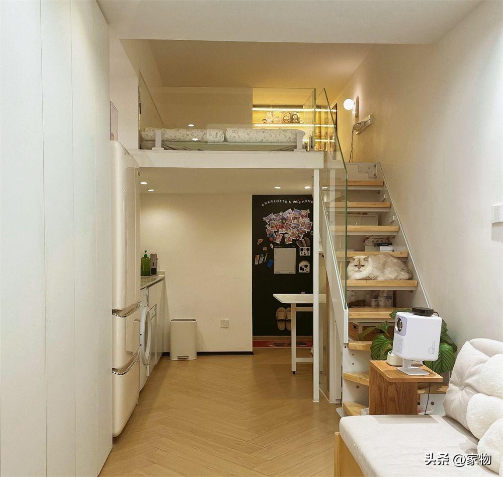 別看蝸居又窄又長,層高卻有三米多,可以在頭頂隔出一張牀位的隔層,當做家裏的主臥室。