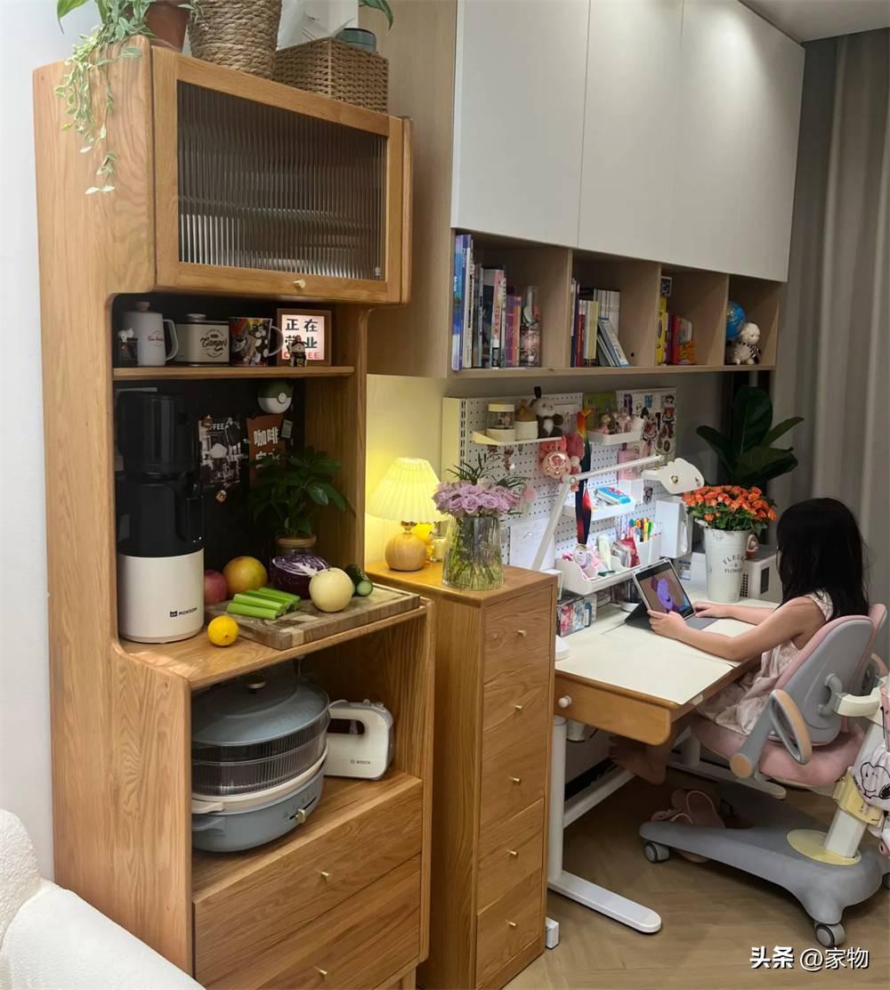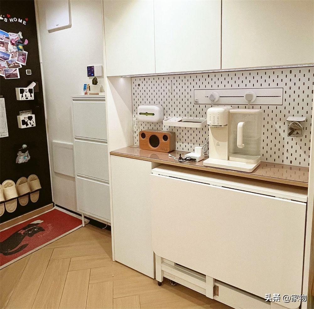 玄關往裏有一組“餐邊櫃”,平日裏就是完全收起的狀態,但用到時,可以將其展開,變成一張小小的四人位餐桌,一家三口在這喫飯用餐剛好合適。