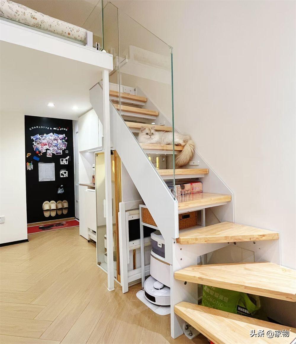 進入家中後,頭頂空間其實並不算高,上面有一個隔層空間分隔樓上樓下,甚至蜿蜒而下的樓梯間內都藏着貓房、掃地機器人等物,不會佔用到寶貴的過道空間。