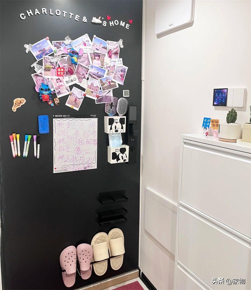 爲了將每一寸空間充分利用起來避免浪費,門上甚至還貼了很多磁吸收納盒,並粘貼了一個拖鞋架,回家後換下鞋子,可以直接掛到上面。