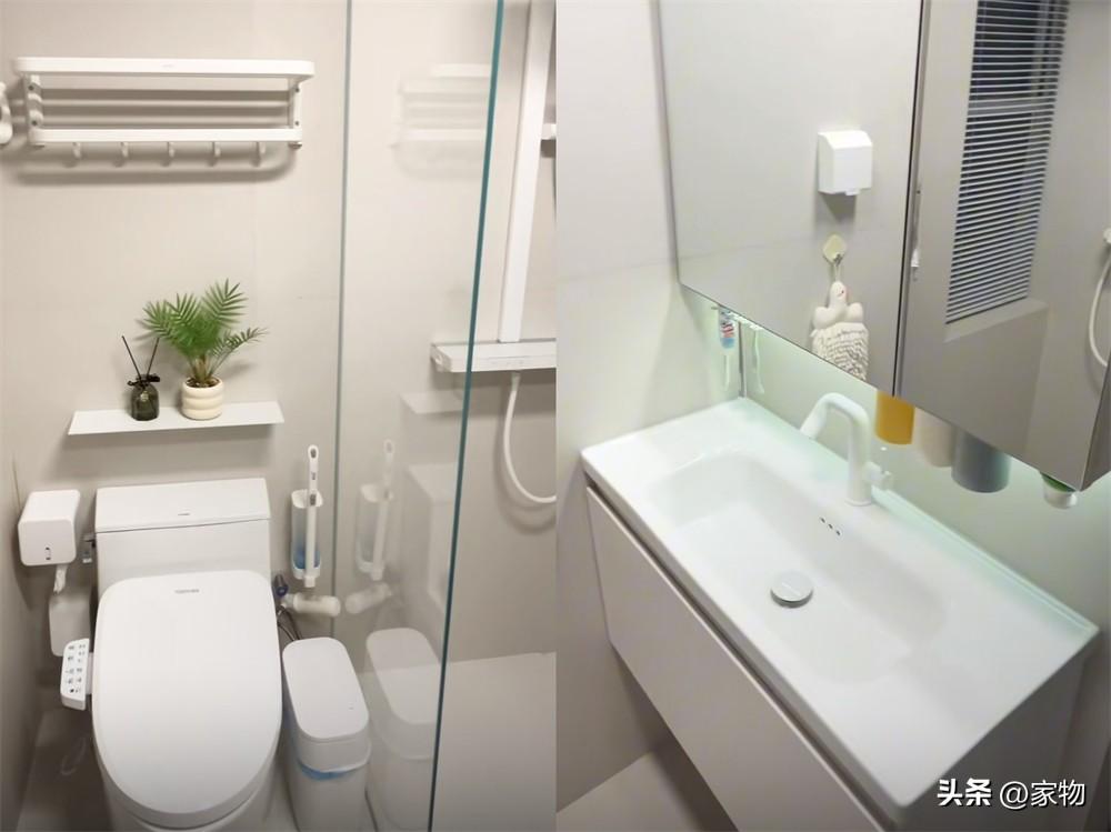 最後再簡單說說衛生間,它也算是家裏唯一一處單獨的空間,就放在了進門右手邊的位置;半牆玻璃浴屏分隔馬桶和浴室,實現乾溼分區,可麗耐的一體洗手檯盆也方便清潔打理,再加上鏡櫃和懸空洗手櫃,收納也算合理。