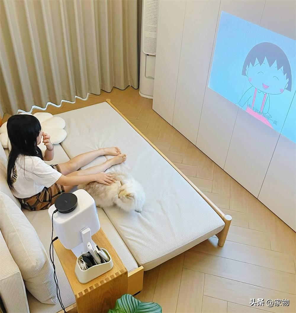 女兒最喜歡窩在上面,一邊擼貓,一邊用投影儀看看動畫,小小的一間客廳,竟被這家人佈置得饒有趣味。