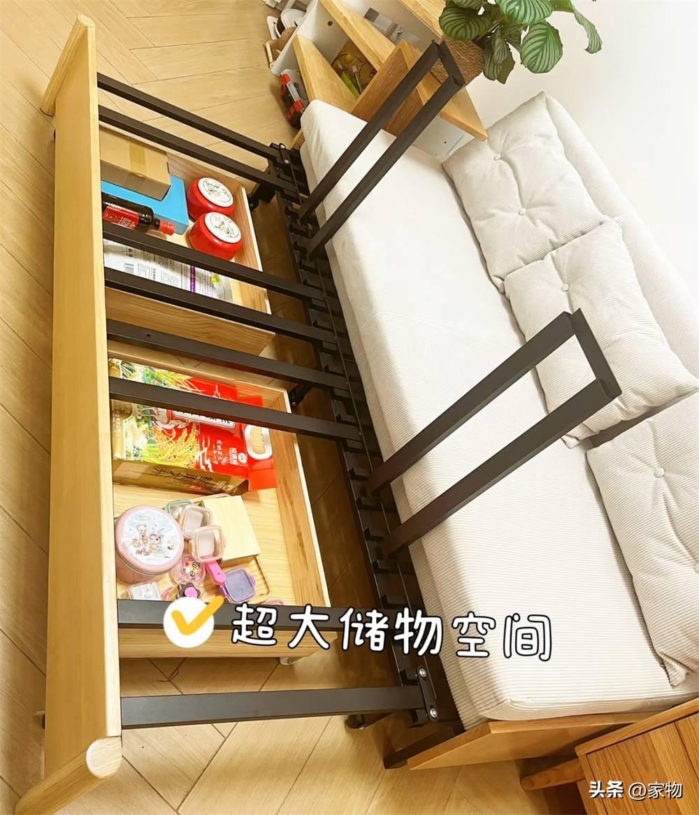 甚至沙發下面,還藏着兩個抽屜儲物空間,平日裏放些零食雜物或者貓貓的貓糧罐頭,也算是減輕了25㎡小家的收納負擔,將更多零散雜物都隱藏收納到了暗處,使家中顯得更加整潔乾淨。