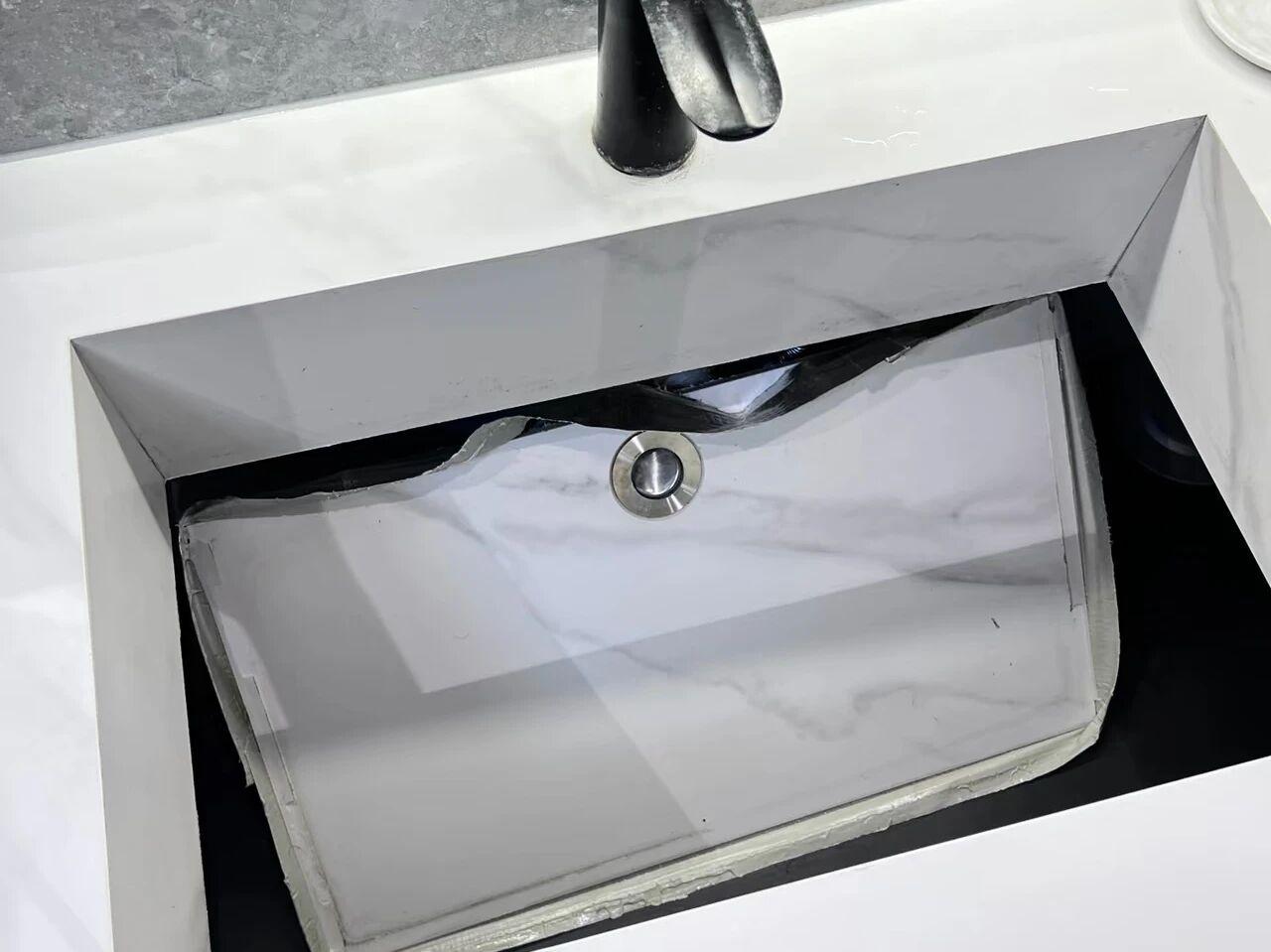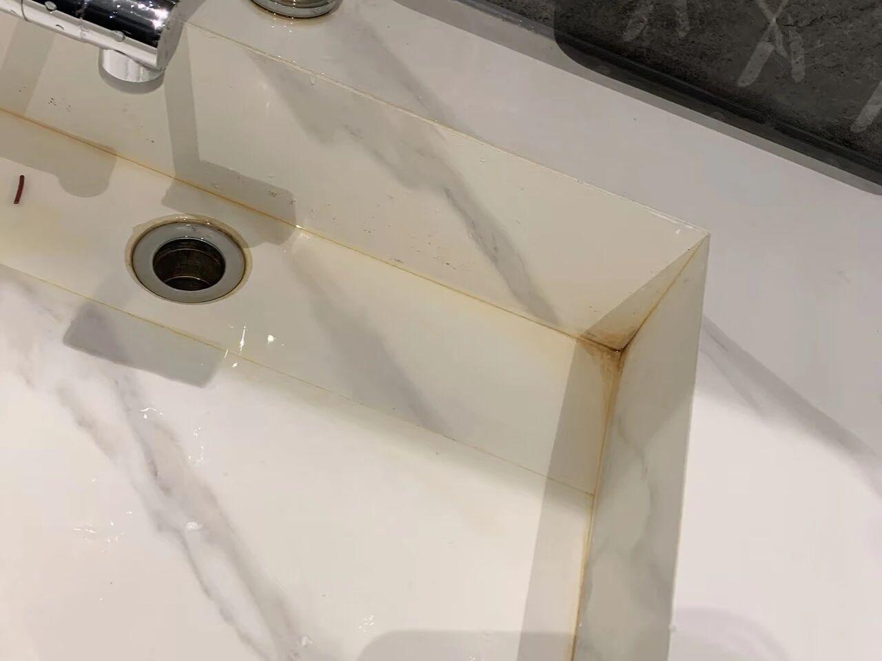 特別有些劣質的巖板盆的底部是不平的,裏面存水。更有甚者,承重不行,安裝的不結實,用着用着盆底掉了。