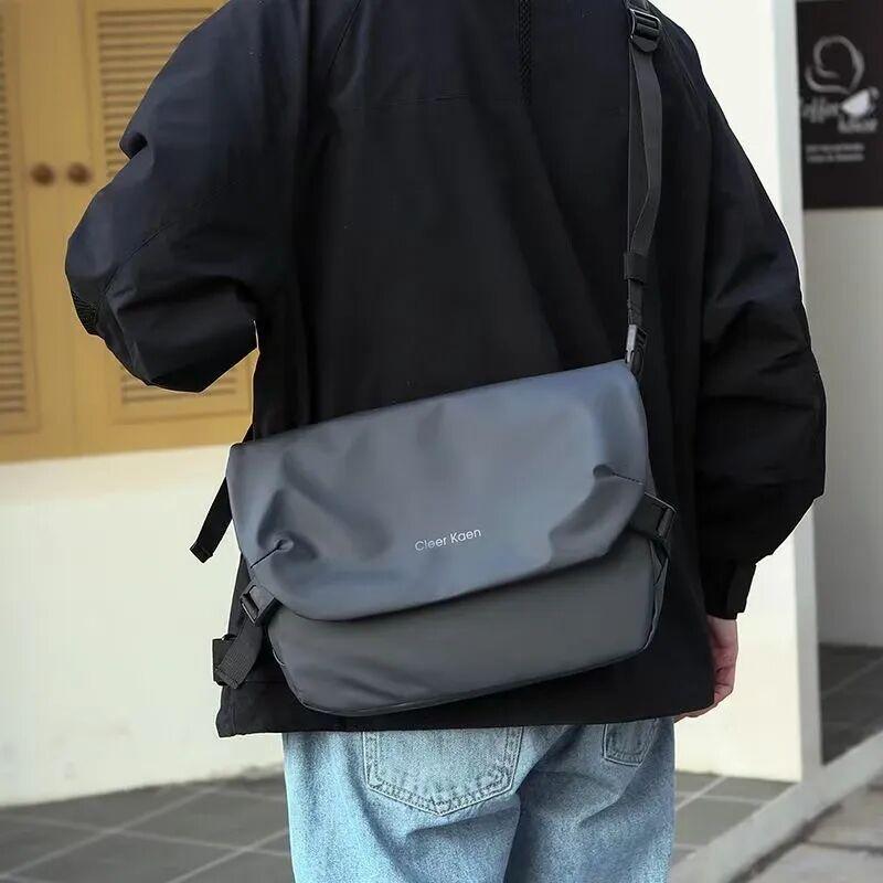 這款斜挎包真的超級帥氣,黑色防水布面材質不僅耐髒,還防水,下雨天背也不怕。