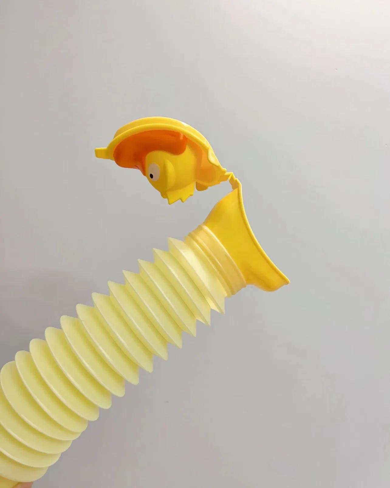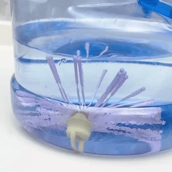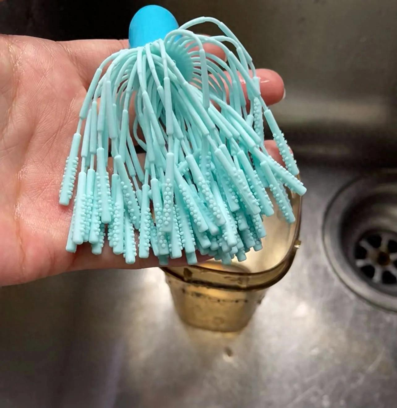 就是本來給奶瓶用的奶瓶刷。它像個水母的樣子,也確實是仿生水母的原理,“觸鬚”的軟硅膠能在狹窄空間內自由彎曲、變形;