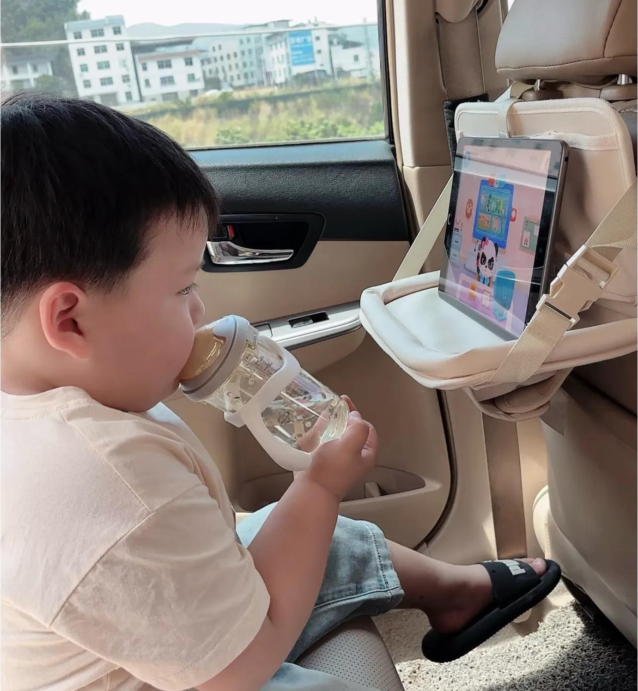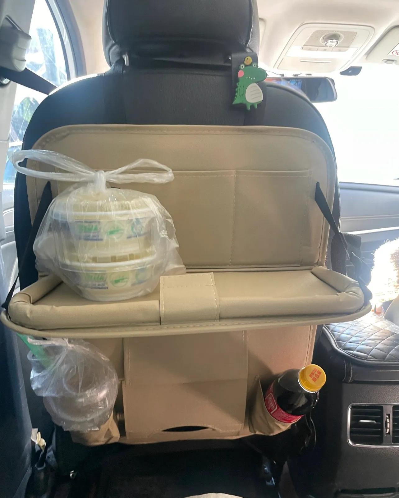 給車裏裝一個帶托盤的掛袋,大人小孩都有用到的時候。