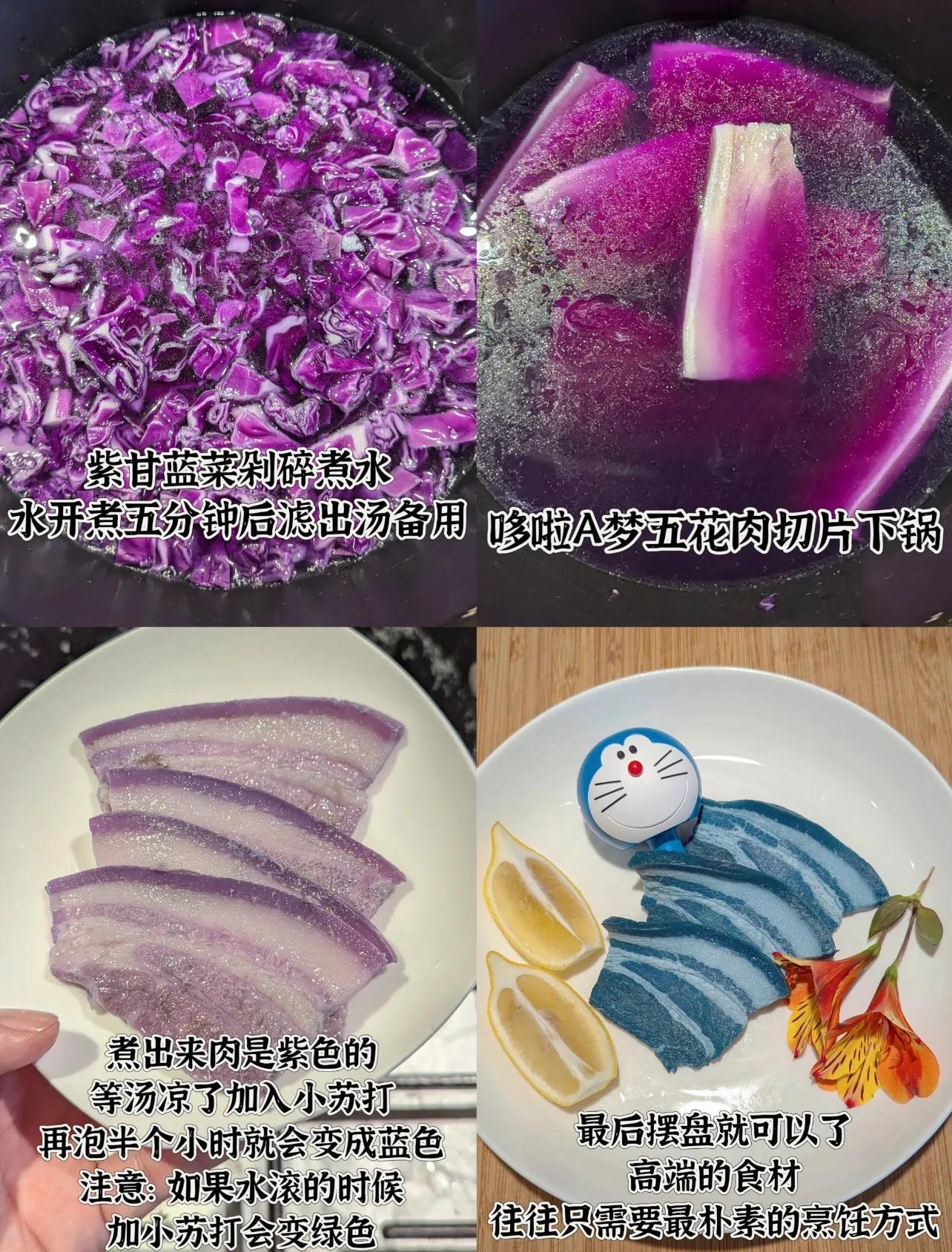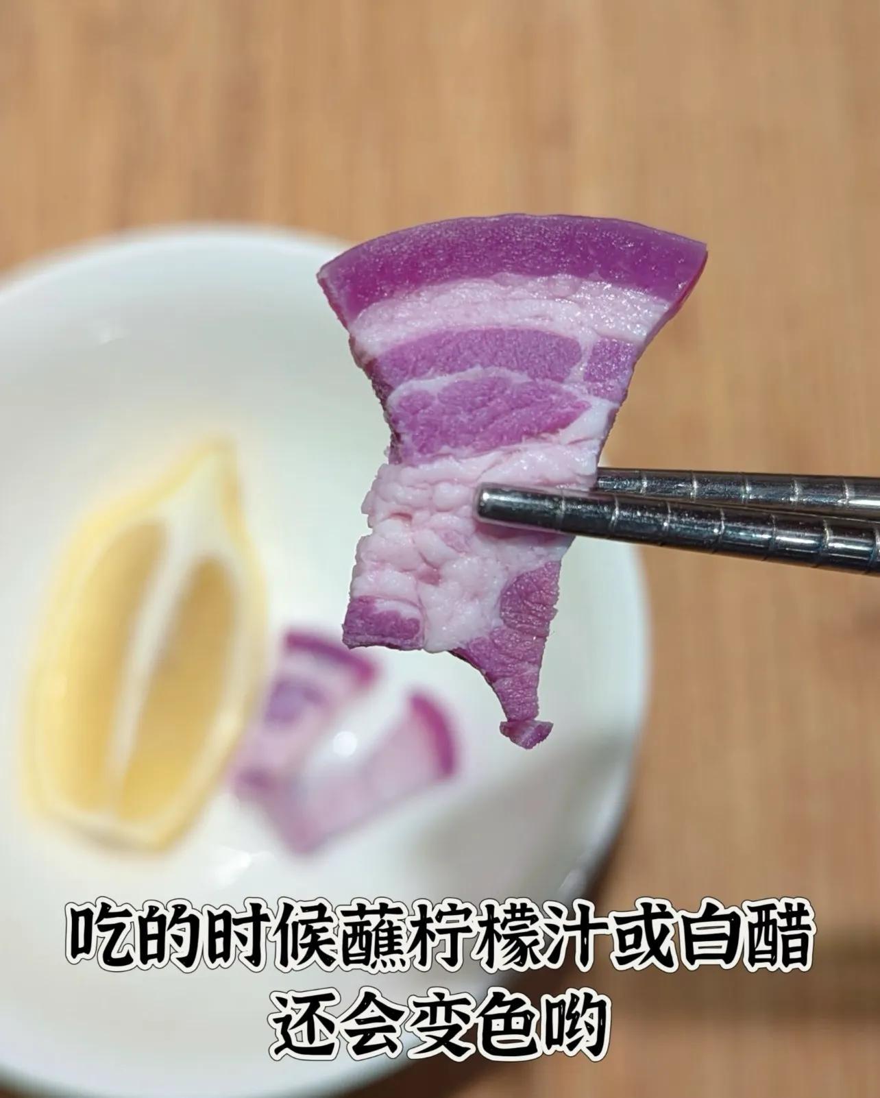 純天然、無色素,紫甘藍剁碎煮水,然後放入五花肉,煮熟。