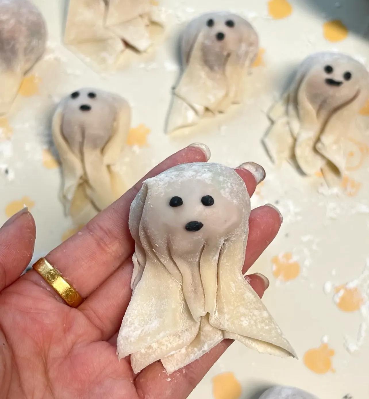 就是普通的餛飩包法,黑色的眼睛嘴巴,是用可食用竹炭粉+麪粉和出來的,很牢固,下鍋煮也不掉!