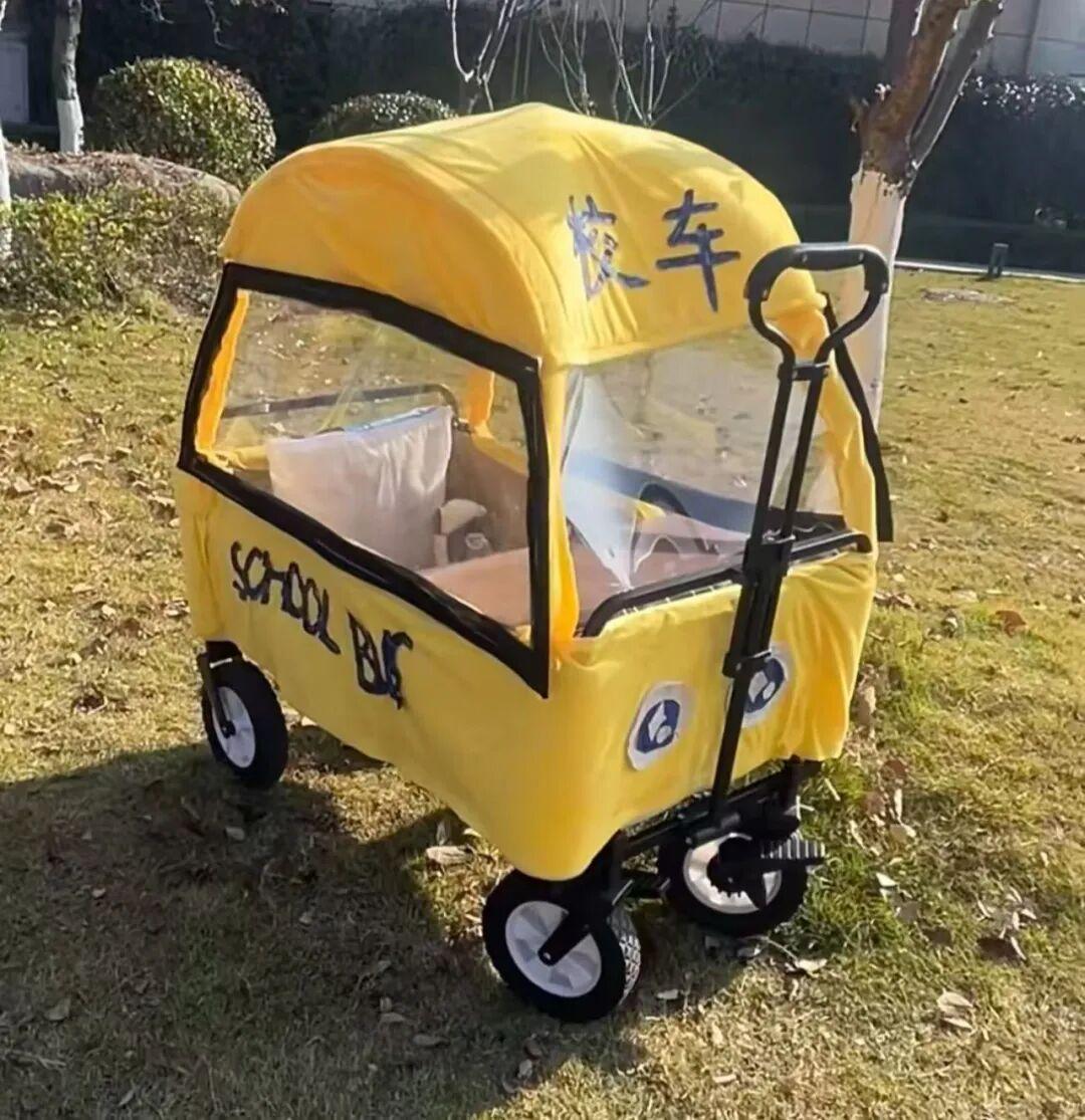 先用PVC鋁塑管搭建車頂框架,然後手縫一個毛絨布料的罩子,用PET薄膜當車窗既,美觀又保暖。