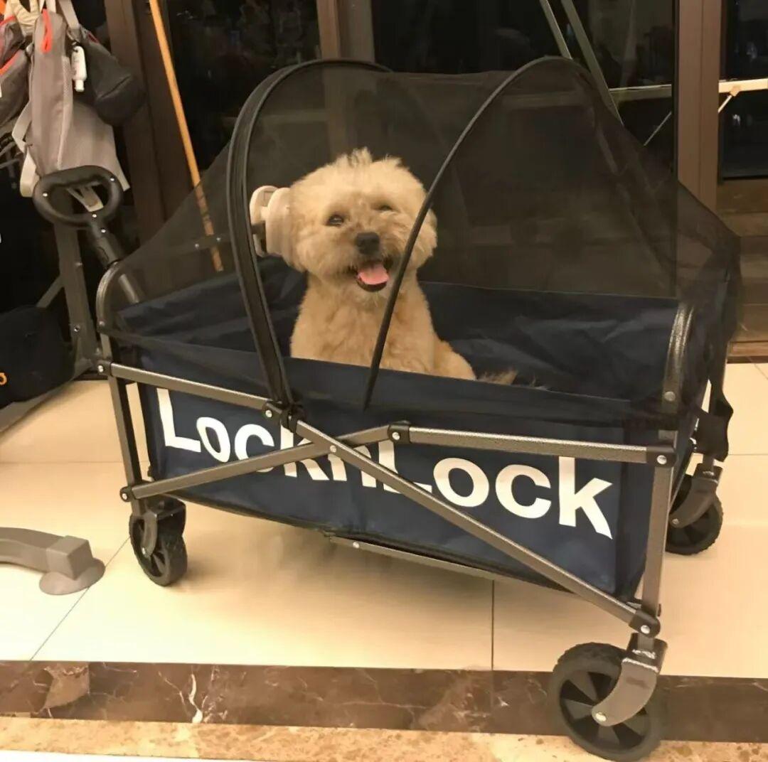 而網友@阿杰卻利用閒置的露營車+一個網沙籠,簡單的改造下,就輕鬆獲得了一個安全又方便的遛狗神器。
