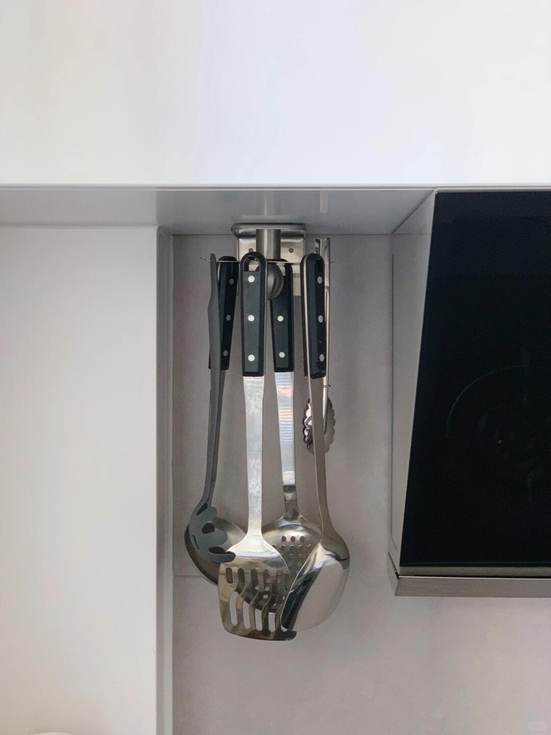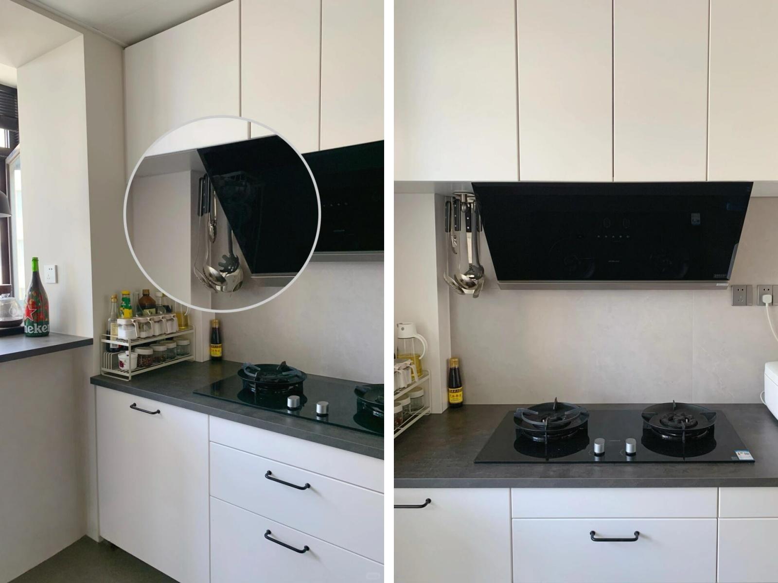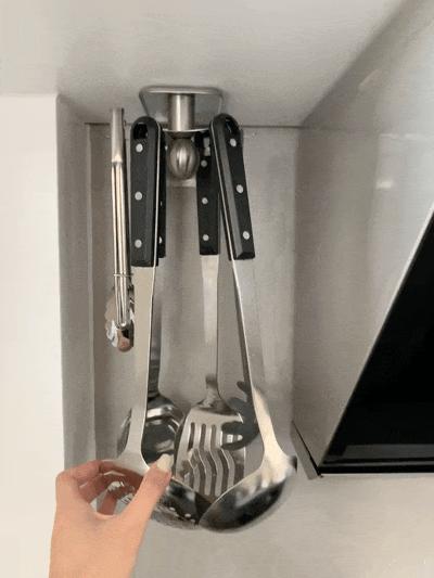 這個旋轉掛鉤其實是我媽先發現的。她家油煙機左邊有個小窄縫,直排掛鉤根本放不下,就在拼多多上找到了這個免打孔的六爪旋轉款,小巧一個剛好填上那塊雞肋空間。