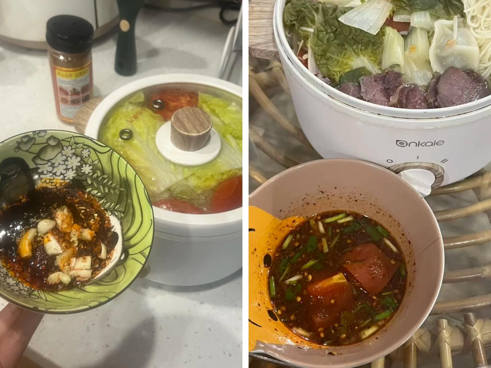 蘸水配方很簡單:一勺單山蘸水,加點蠔油、醋、蒜末、雞精和木姜子油,再搗個番茄進去,最後用煮菜的水一衝——蘸什麼都絕了。鍋裏清水煮點喜歡的食材,20分鐘就能開喫,方便、美味,還助減肥。