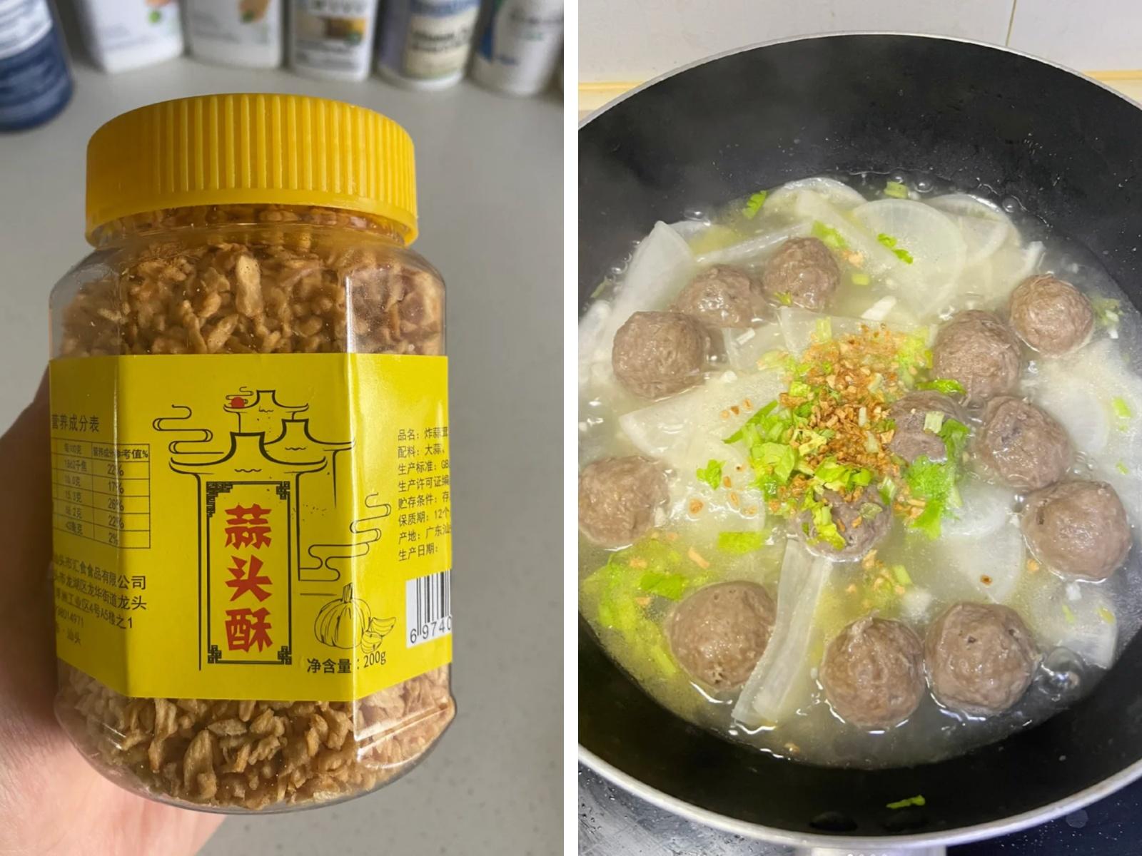 尤其愛做蒜頭酥牛肉丸湯:水開下丸子,煮到浮起,加點鹽、蝦皮、芹菜段,再滾個十幾秒,最後撒勺蒜酥一攪——鮮、快、清爽,特別適合沒胃口時來一碗,手殘黨都能做好喫。