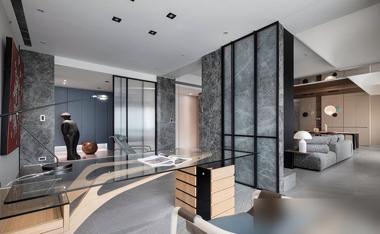 玻璃移門一拉,秒變獨立辦公室,加班開會不受打擾;門開着呢,又能和客廳接上話茬。