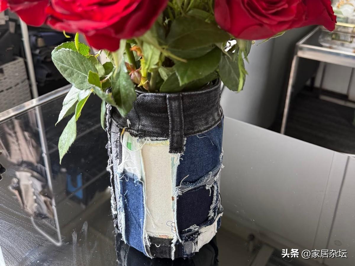 直到看見我老媽用家裏的舊毛衣的袖子,還有就是衣身的部分,根據玻璃花瓶和塑料花瓶的大小,進行了裁剪。讓我驚訝的是她還會用熱熔膠將這些布料緊緊的粘貼在花瓶的外部,一個好看的花瓶套就出現了。