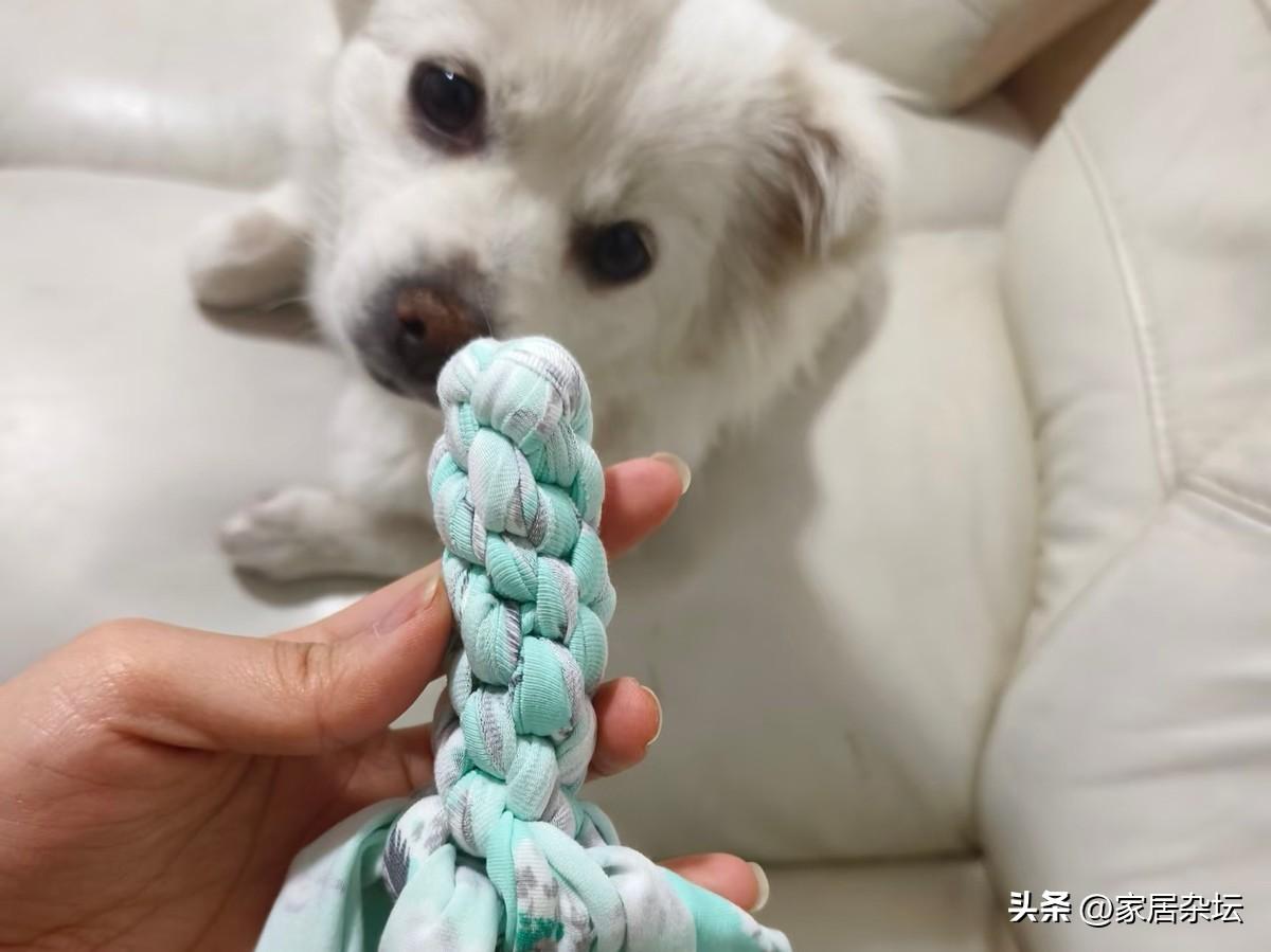 只要家裏有一些舊衣服,就可以製作。將不同顏色的舊布條,可以編成堅固的麻花辮,兩端上打上死結,就做成了一個簡單的拉扯玩具了。或者是用布料縫成小球,裏面塞入一個會響的塑料瓶蓋就可以了。