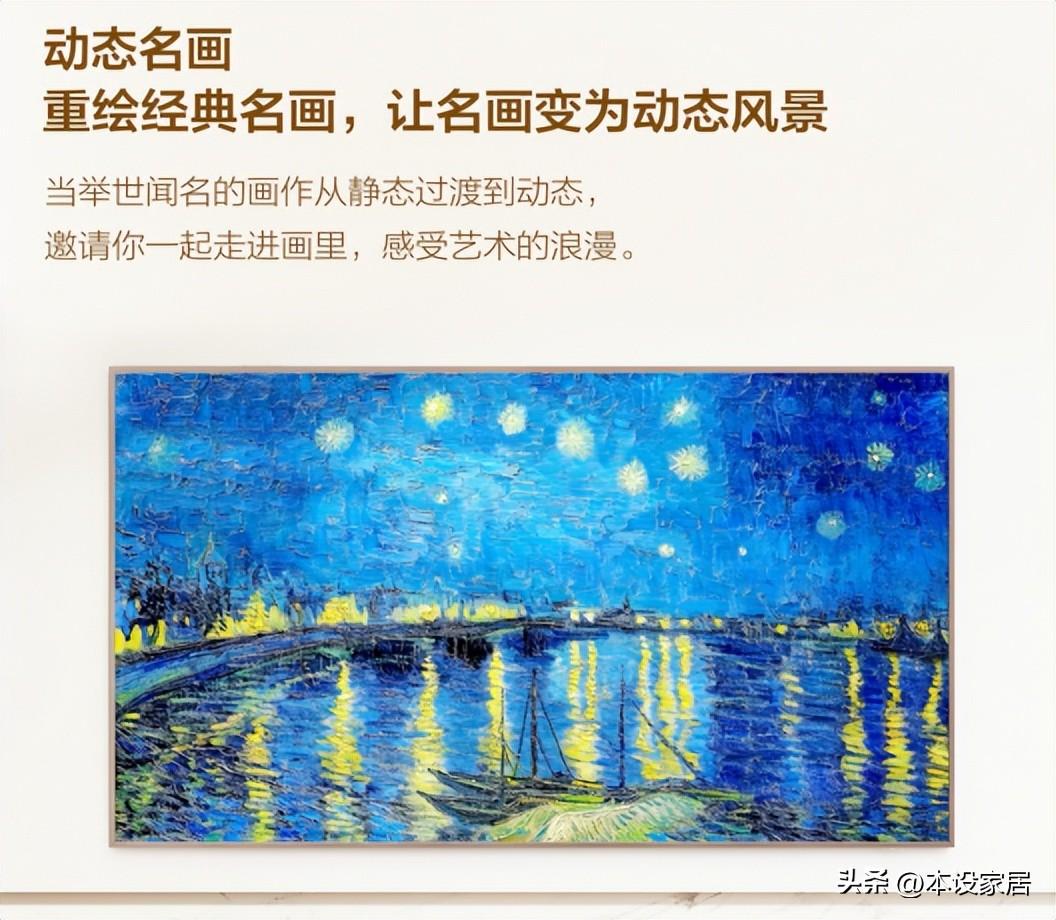 光是外表好看還不夠,要我說,關掉節目後,A400 Pro的藝術潛能才真正釋放。一方面它內置上百幅免費世界名畫,印象派大師、現代藝術、抽象幾何、自然風光等類型壁紙應有盡有,待機即可切換爲私人藝術展廳。此外,還有動態名畫功,比如讓梵高的星空流動起來,靜態傑作立馬“活”了過來。想要擁有自己專屬的藝術作品也能得到滿足,通過AI藝術功能,僅需輸入3個關鍵詞,3秒就能生成專屬畫作。