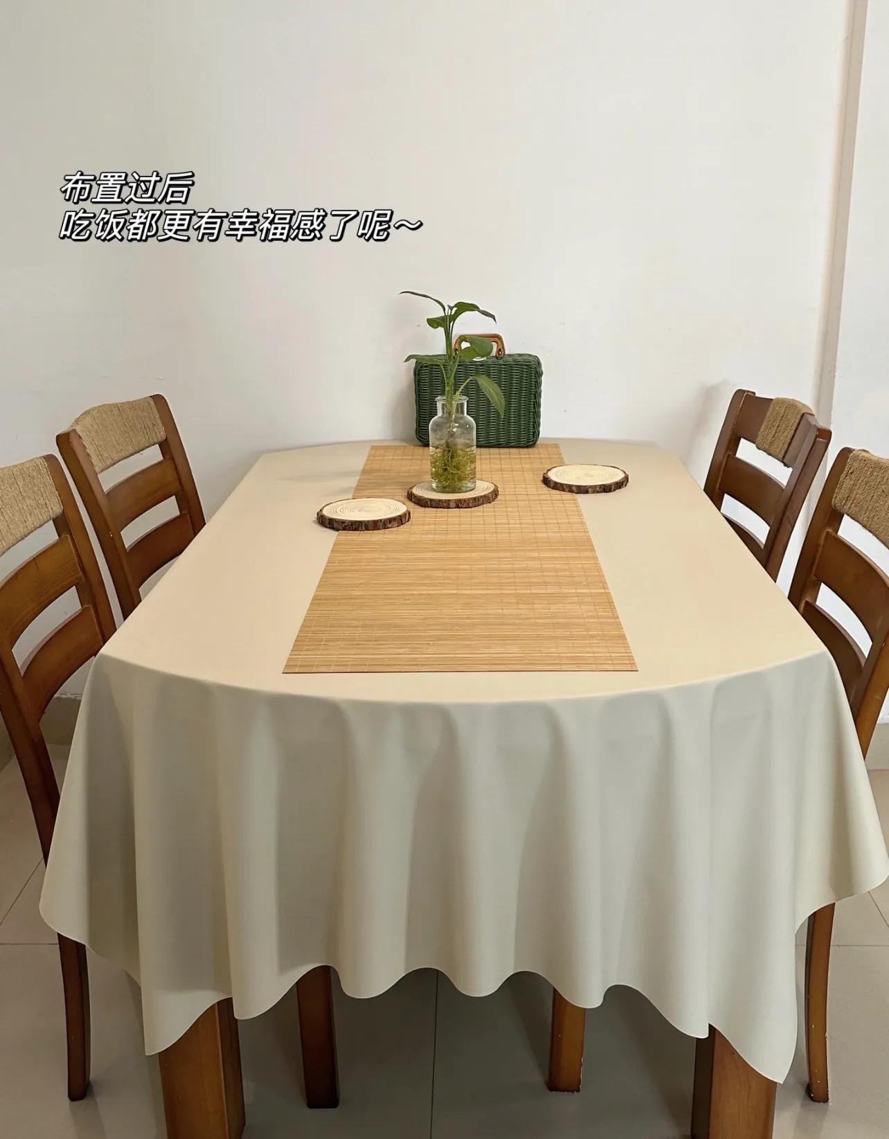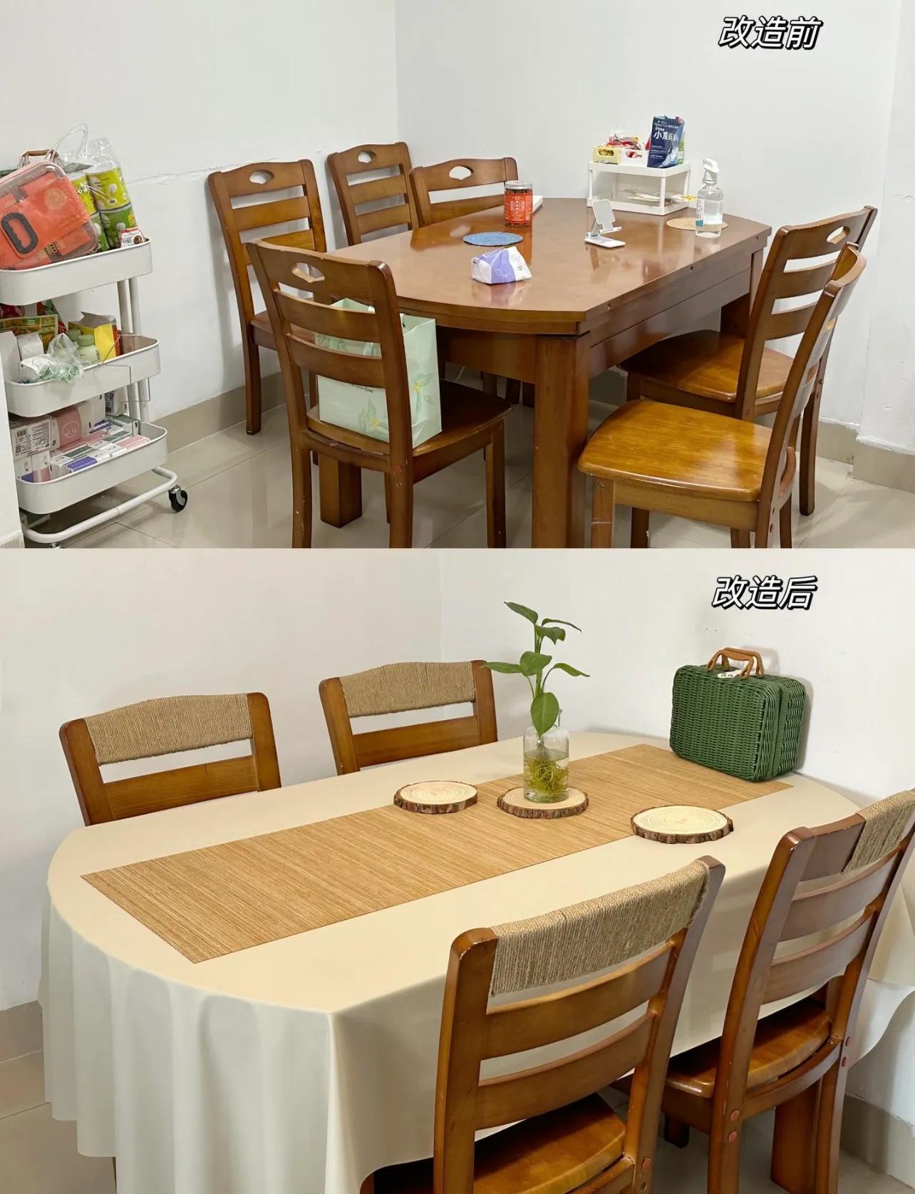 既能遮蓋歲月的痕跡,又讓餐廳的顏值提升了一大截,我還加鋪了一塊竹餐墊,要麼不弄,弄就必須拉滿層次感!