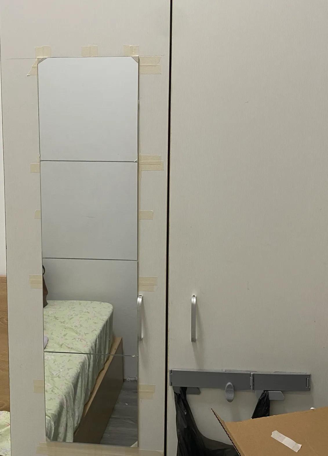 原來的鏡子是一片一片拼接貼牆的,照的人腰線在哪都不確定,現在回想起來,真就是純湊合,光圖便宜。