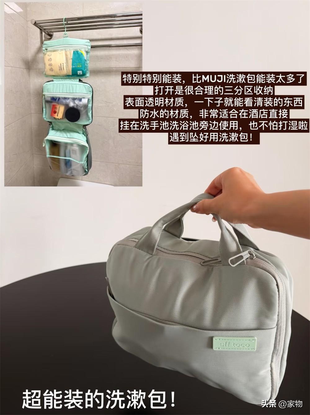 別看這小洗漱包尺寸不大,但卻特別能收納,表面看起來就是一個帶提手的小小手提包,但實際上打開後,裏面內有乾坤,分成了三個各層分區。