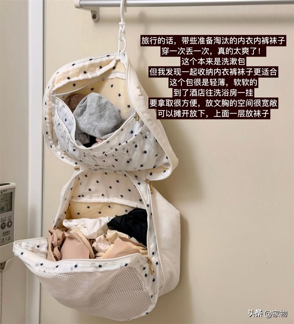 一開始,它其實也是個化妝包,但買回來後才發現,其實用它裝內衣更合適,比起上面說的化妝包來說,它尺寸要略大一些,且同樣自帶掛鉤,裏面收納內衣內褲等物,掛在酒店衣櫃或浴室都OK,同樣好用。