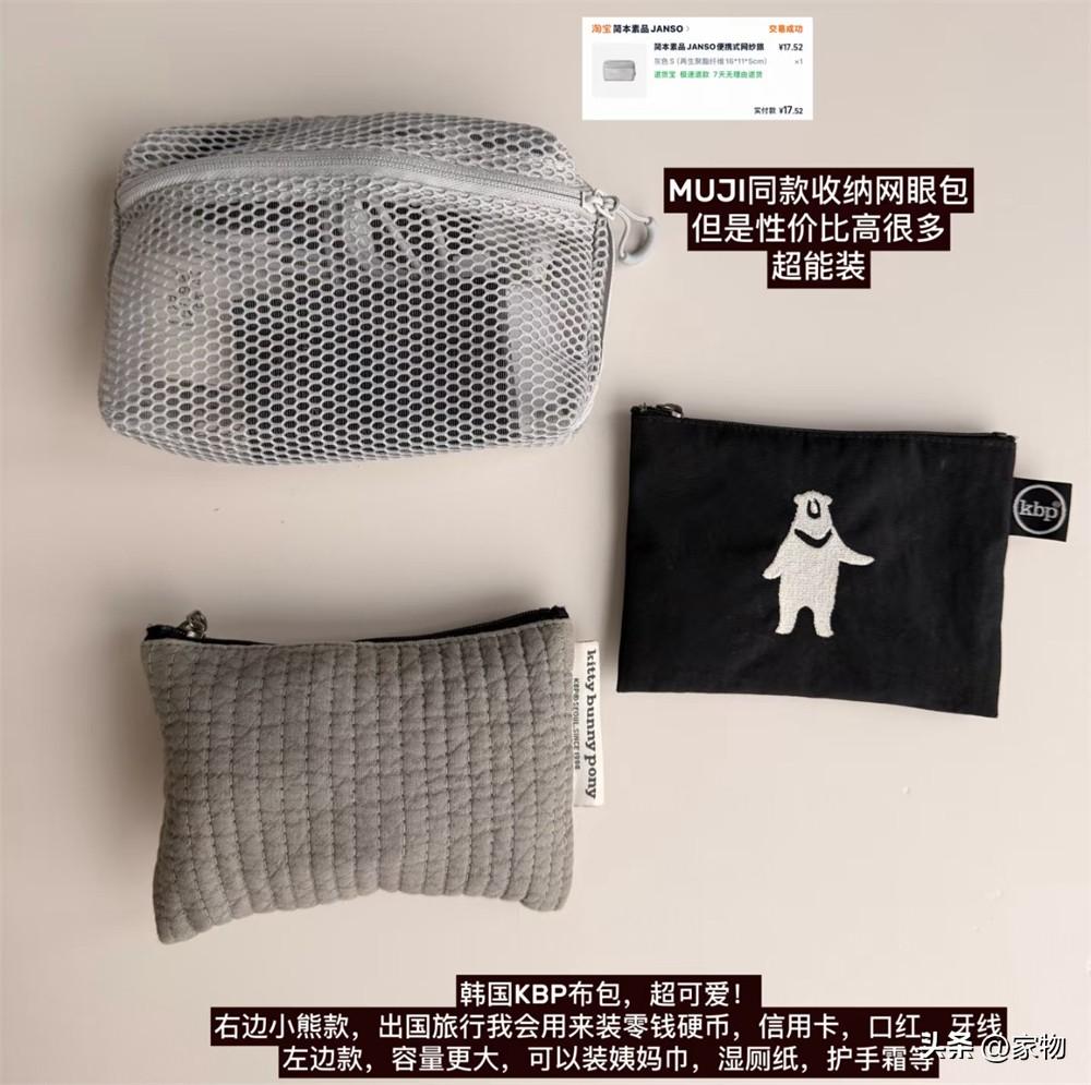 出門在外,總會用到一些隨身收納物品,我這三種小布包便恰到好處,一個用來裝硬幣卡片等物,另外一個網眼的當化妝包收納口紅等物,小小布包則用來裝些姨媽巾、溼廁紙之類的物品,放到大包裏也一目瞭然,方便拿取。