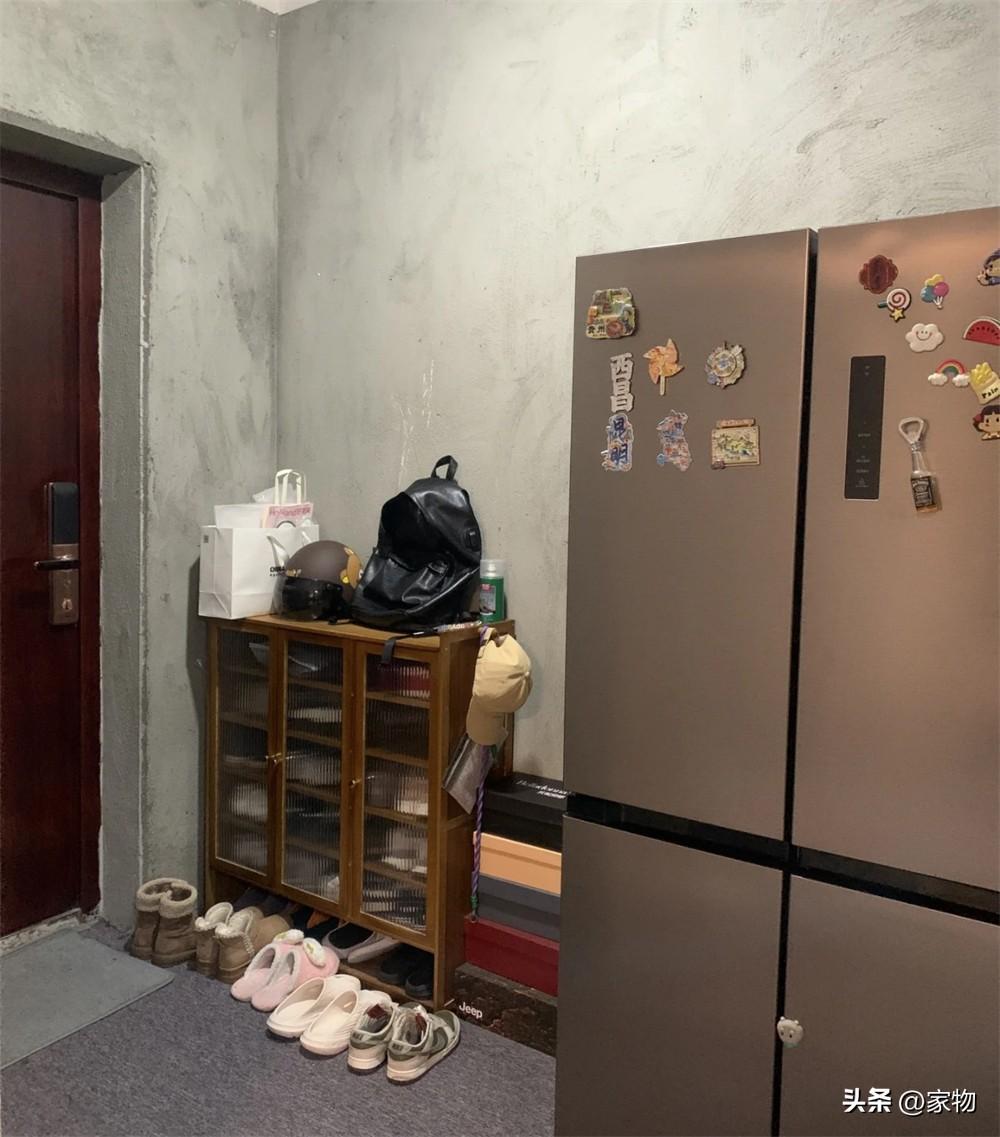 推門進入家中的玄關後,有一個單獨的玄關,原本是預留有做定製玄關櫃的空間,但現在只是放下一組小號的成品鞋櫃,方便收納兩人的鞋帽和隨身用品,甚至爲了節省空間,連大冰箱也直接放在了玄關裏。
