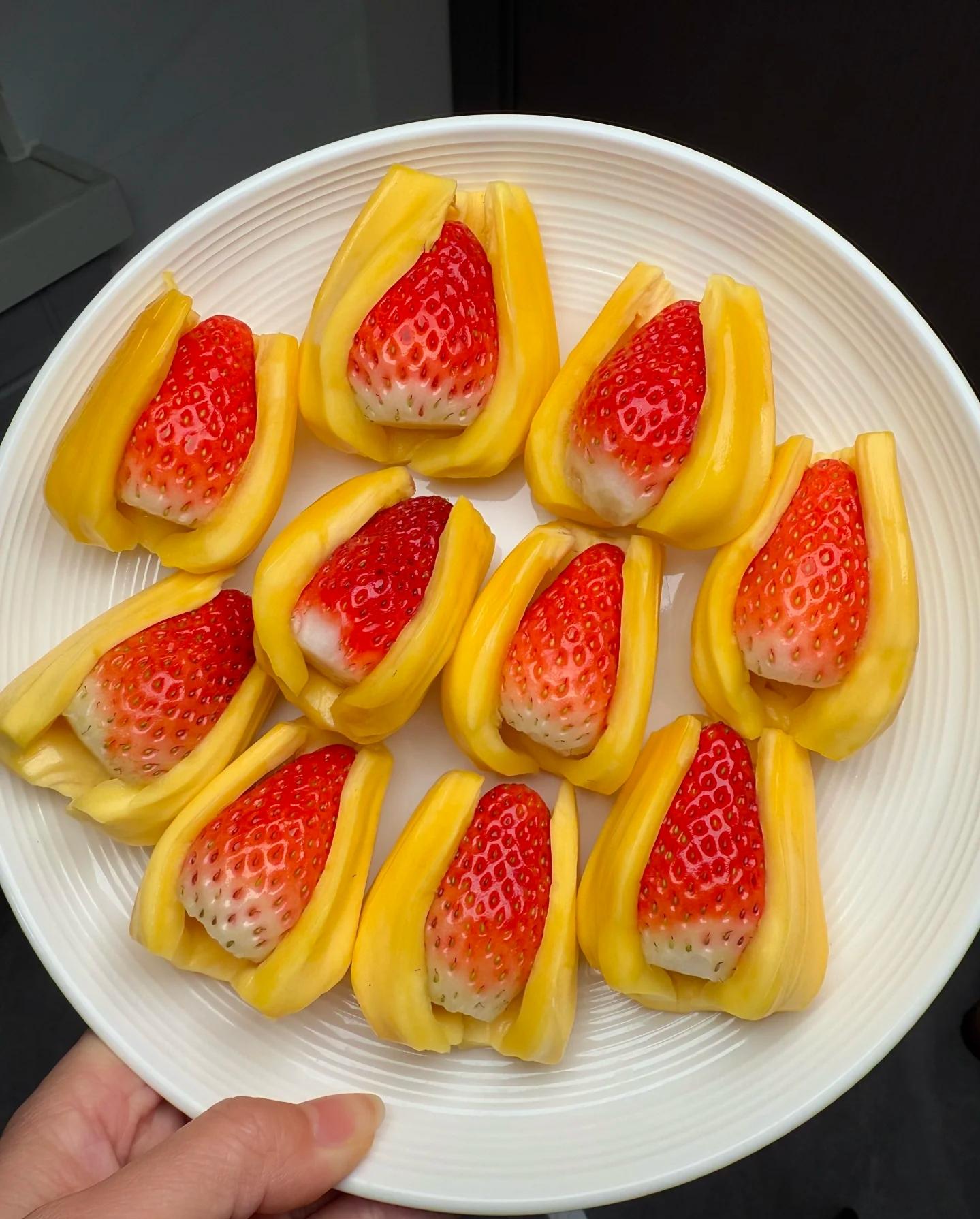 看似很抽象,實則還挺妙的。菠蘿蜜的艮揪,夾上草莓一口爆汁,再結合菠蘿蜜和草莓雙香奔赴的味道,一個濃香,一個清甜,相當於一邊打架,一邊擁抱,sorry,畫風逐漸虐戀了起來……