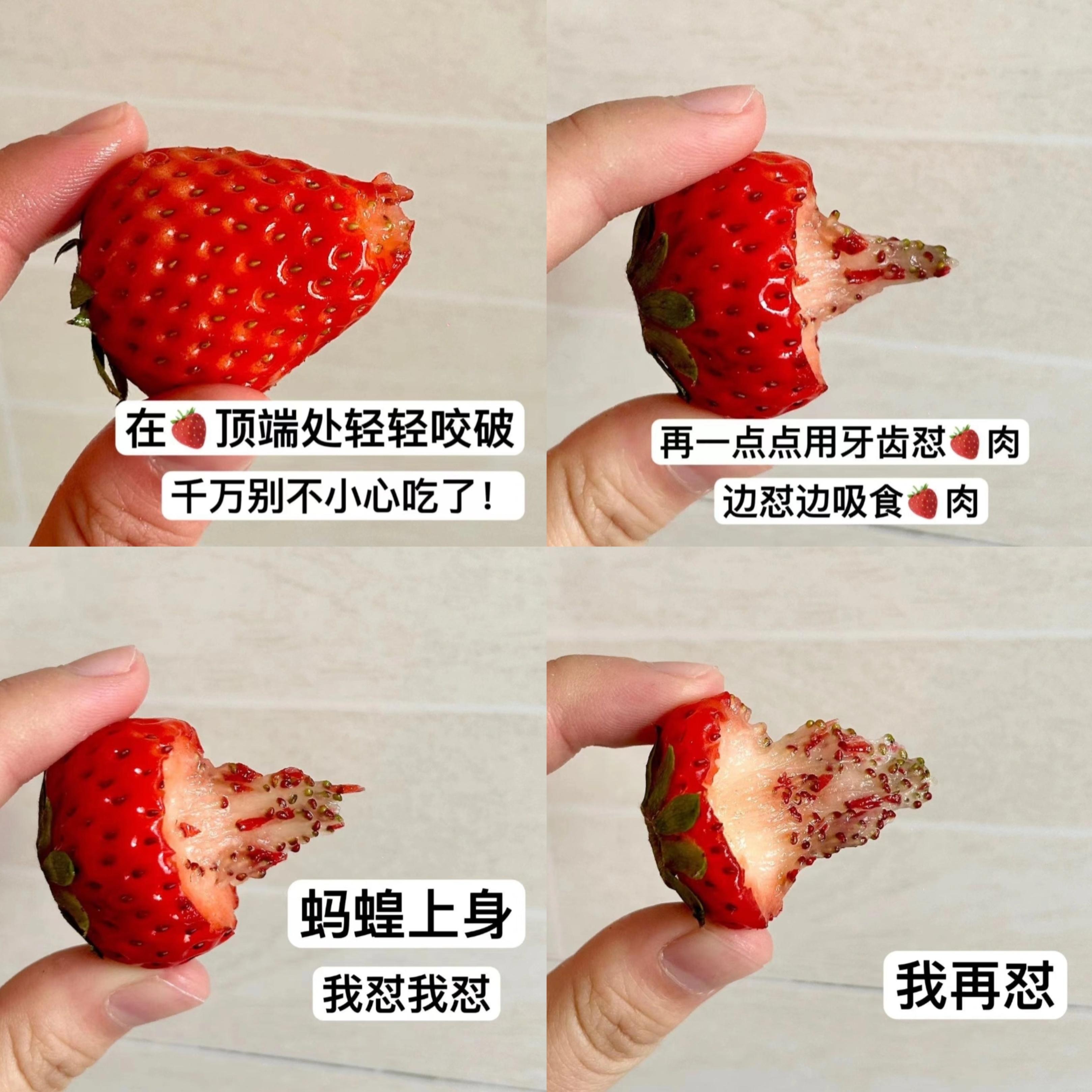 成功祕笈:草莓最好選偏硬的,好吸一點;先在草莓尖尖輕輕開個小口,然後就是靠牙齒一點點地懟草莓肉,把懟掉的草莓肉吸掉,邊懟邊吸,忍住不要咬斷;