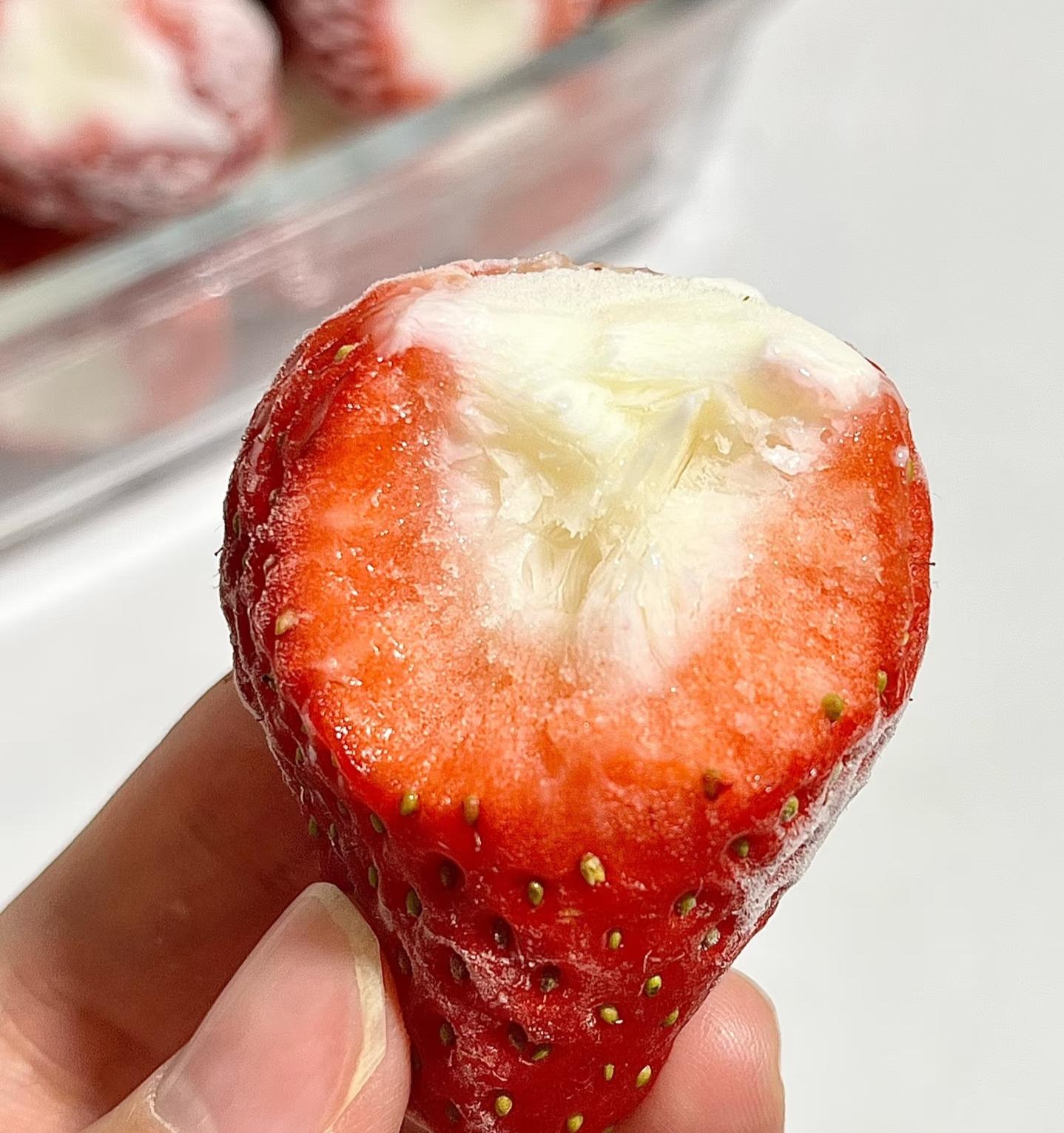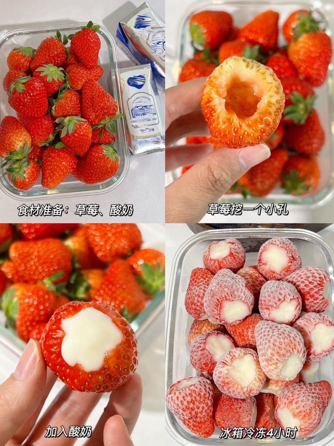 做法特別簡單:把草莓挖一個洞,灌滿酸奶,送進冷凍室,冷凍4個小時左右。大西北、大東北直接窗外陽臺,我沒說錯吧。