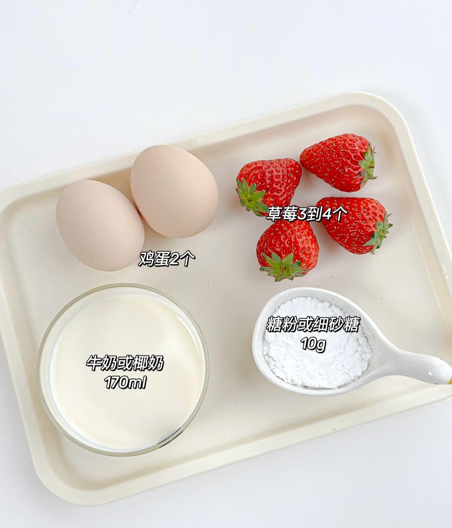 準備材料:草莓、雞蛋、牛奶或者椰奶,170ml爲佳,也可以根據自己的用量調整,烘焙用的糖粉或細砂糖。