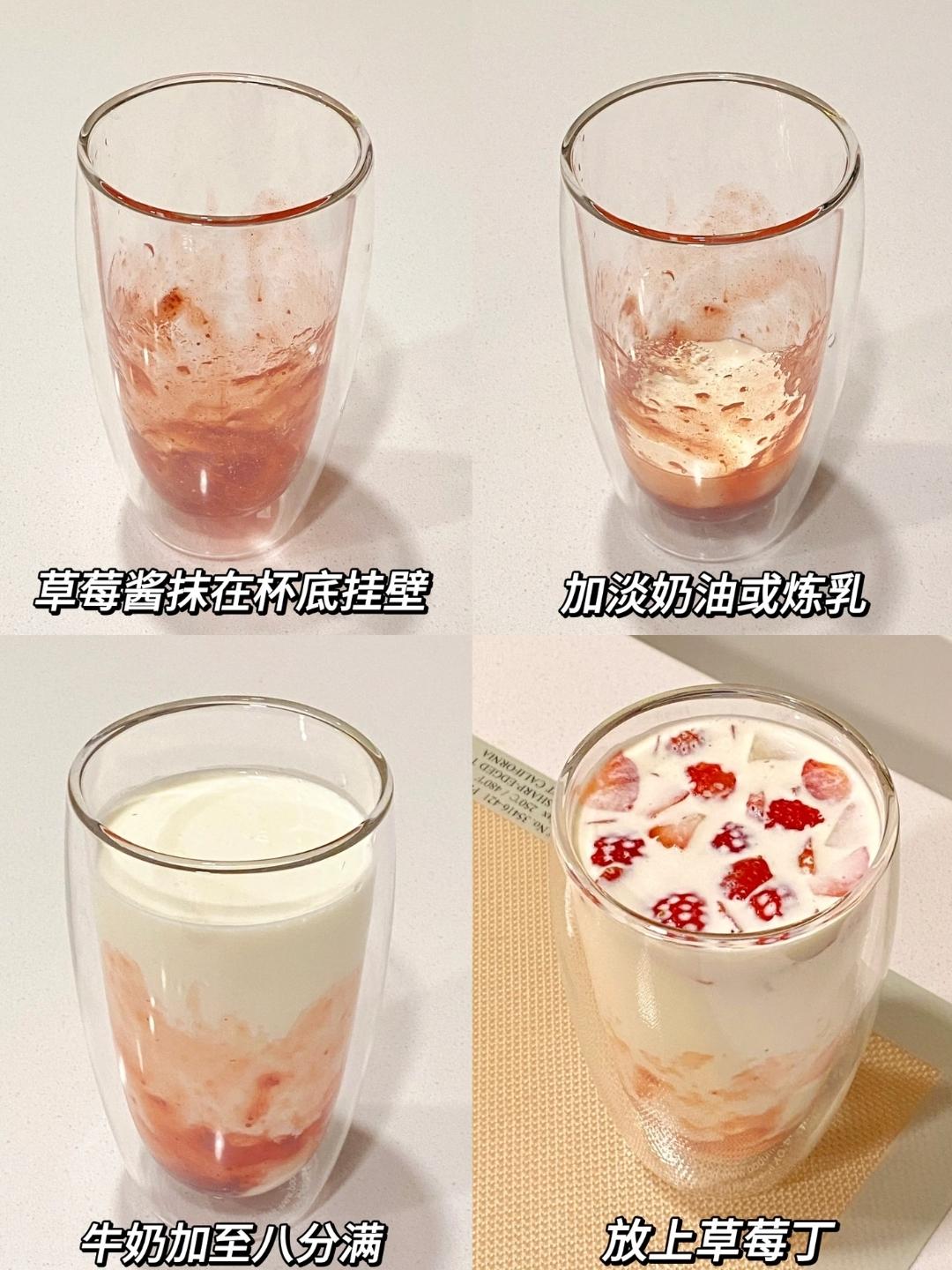 ①把草莓醬抹在杯底部分,形成掛壁的效果;